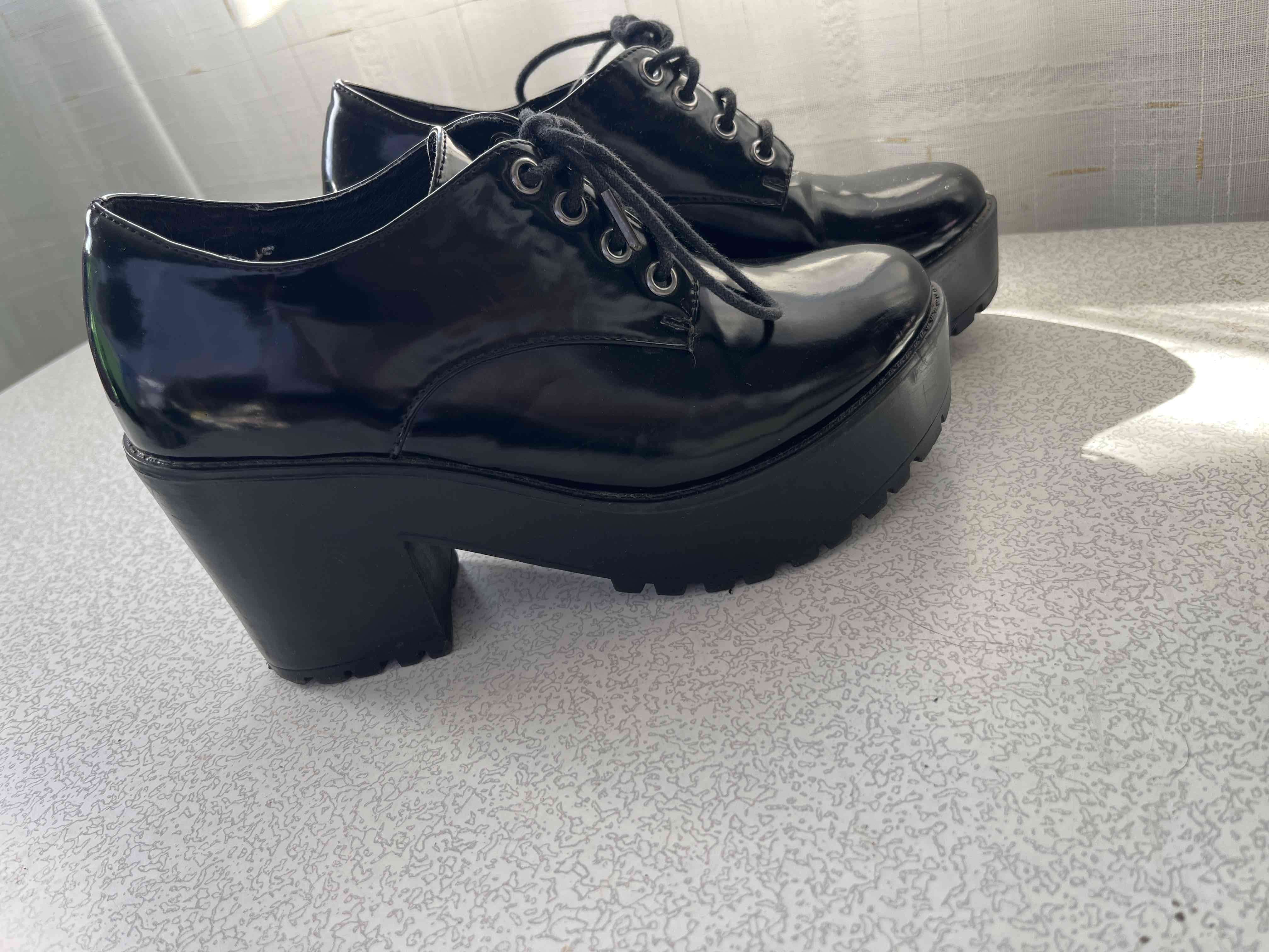 Zapatos de plataforma negros charol, estilo moderno y sofisticado. En buen estado general.
