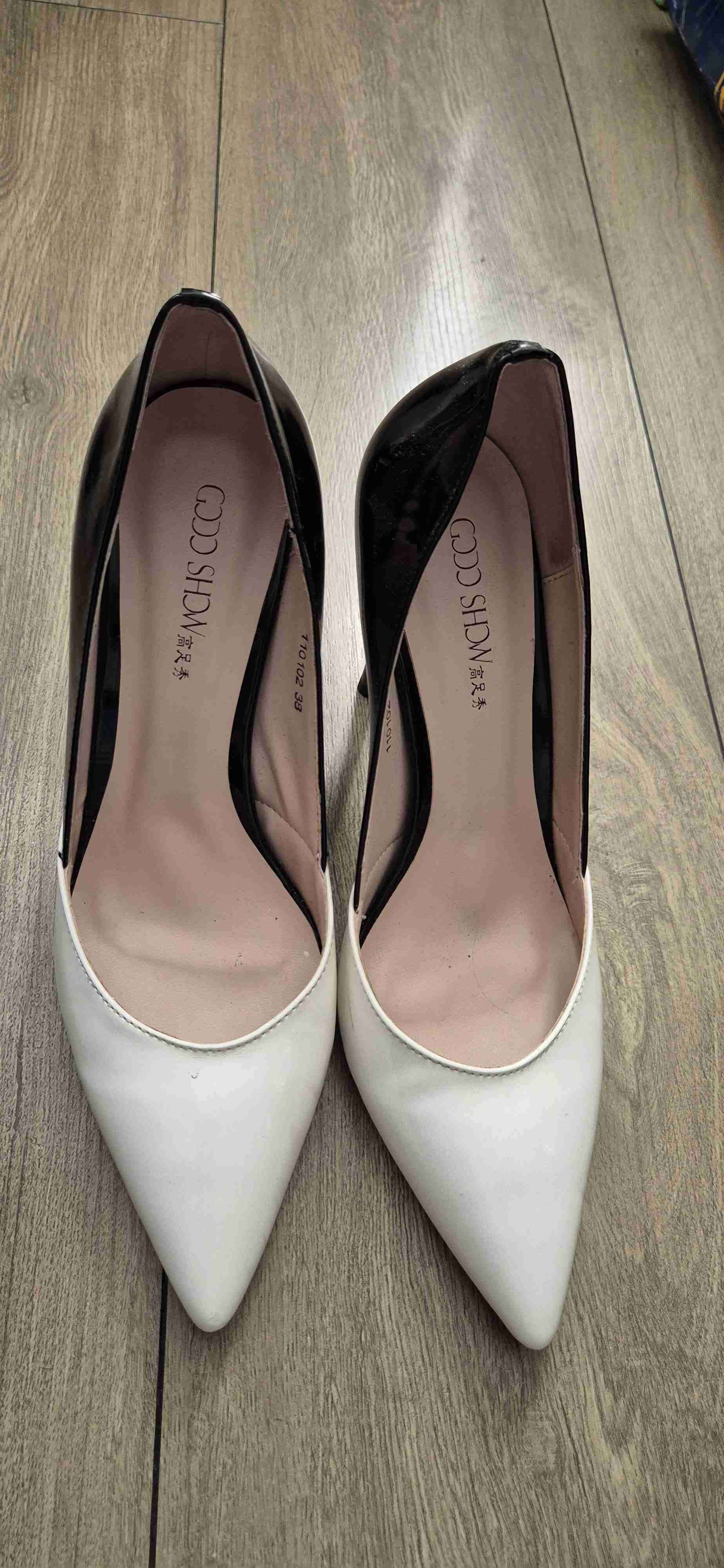 Zapatos de tacón con diseño en blanco y negro, perfectos para ocasiones formales. En buen estado, con leves marcas de uso.