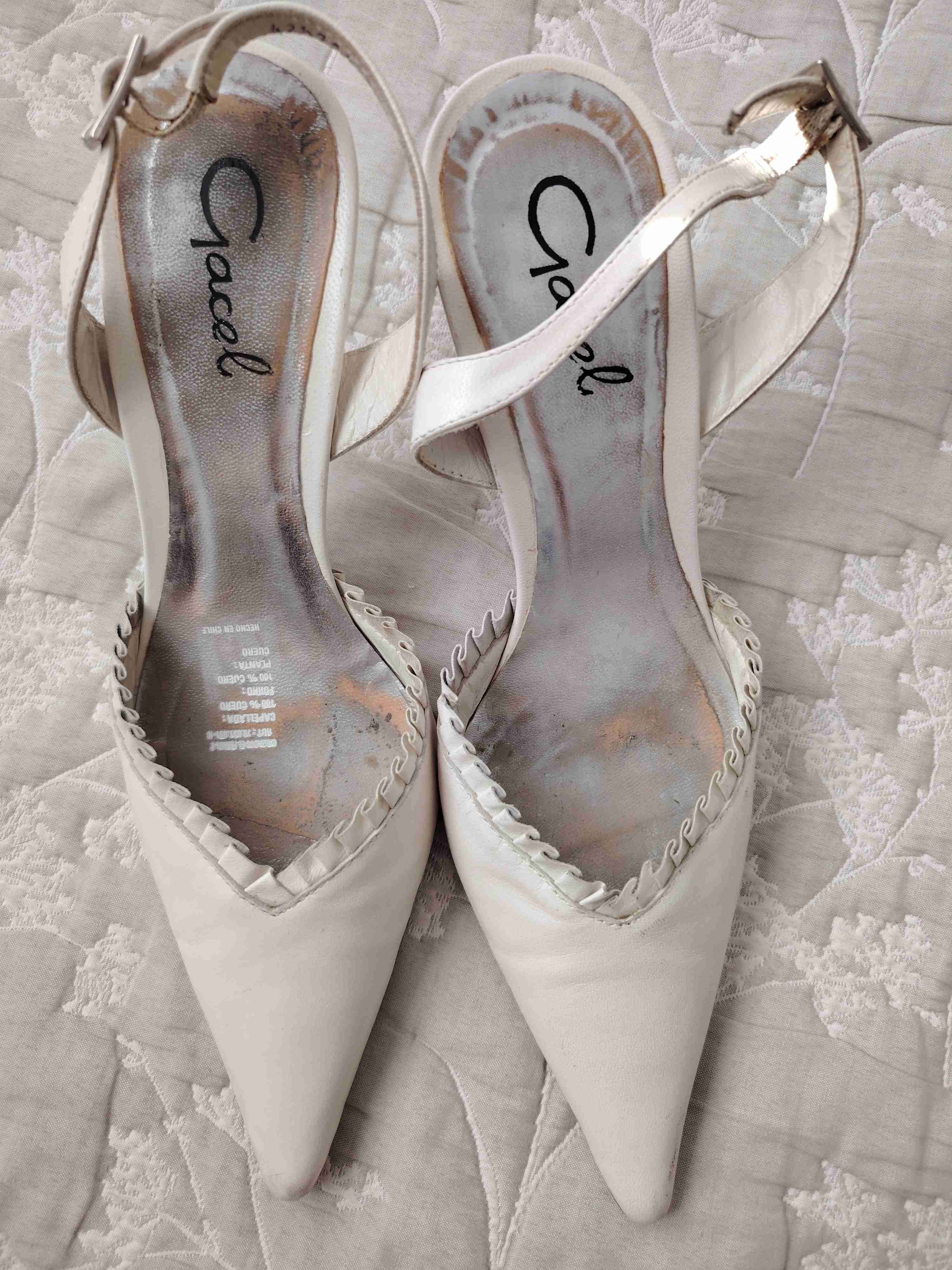 Zapatos color crudo con taco y diseño elegante, ideales para ocasiones formales. En buen estado con signos leves de uso.