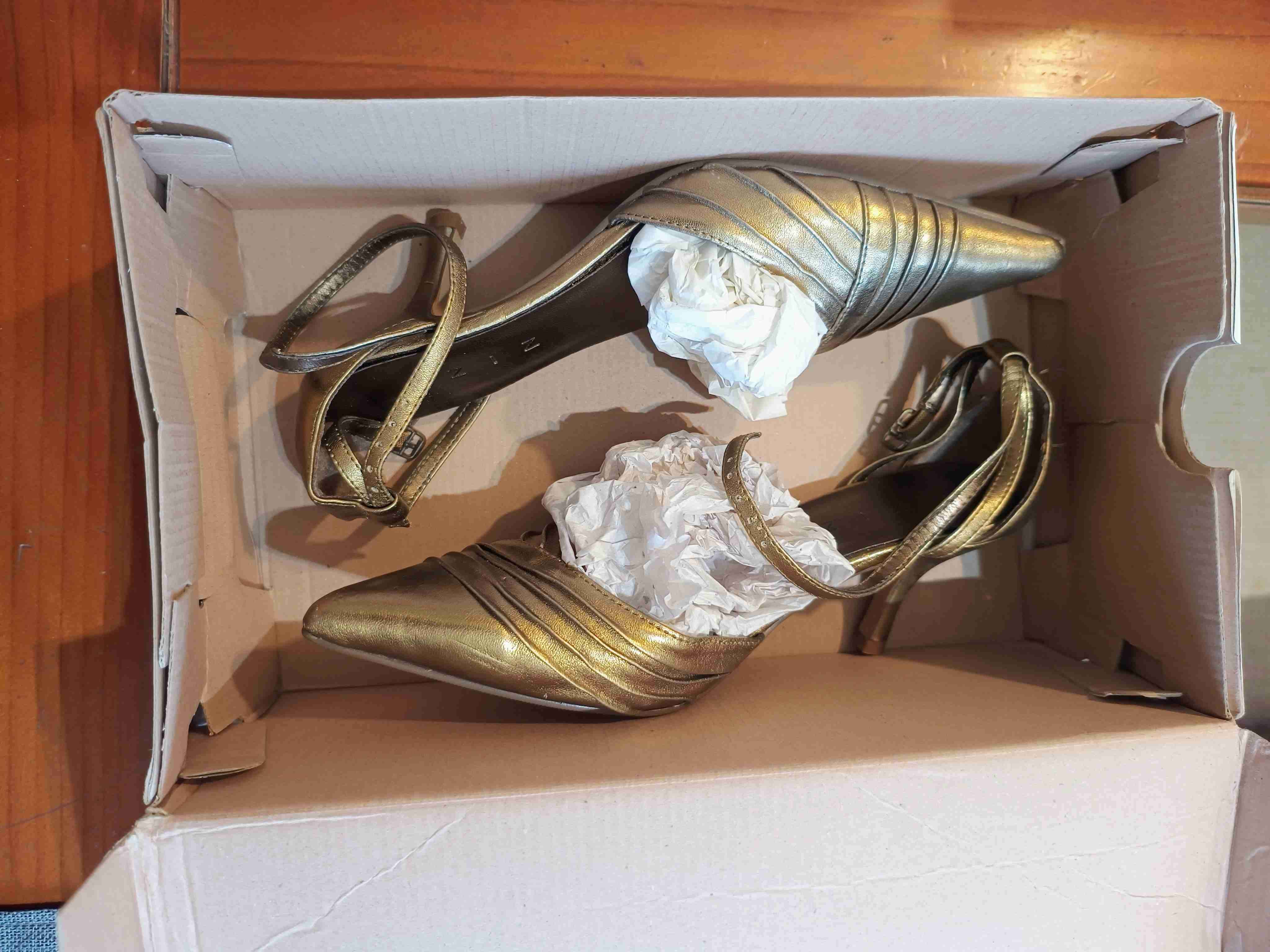 Elegantes zapatos de tacón dorados, perfectos para eventos formales. En buen estado, con pequeños signos de uso.