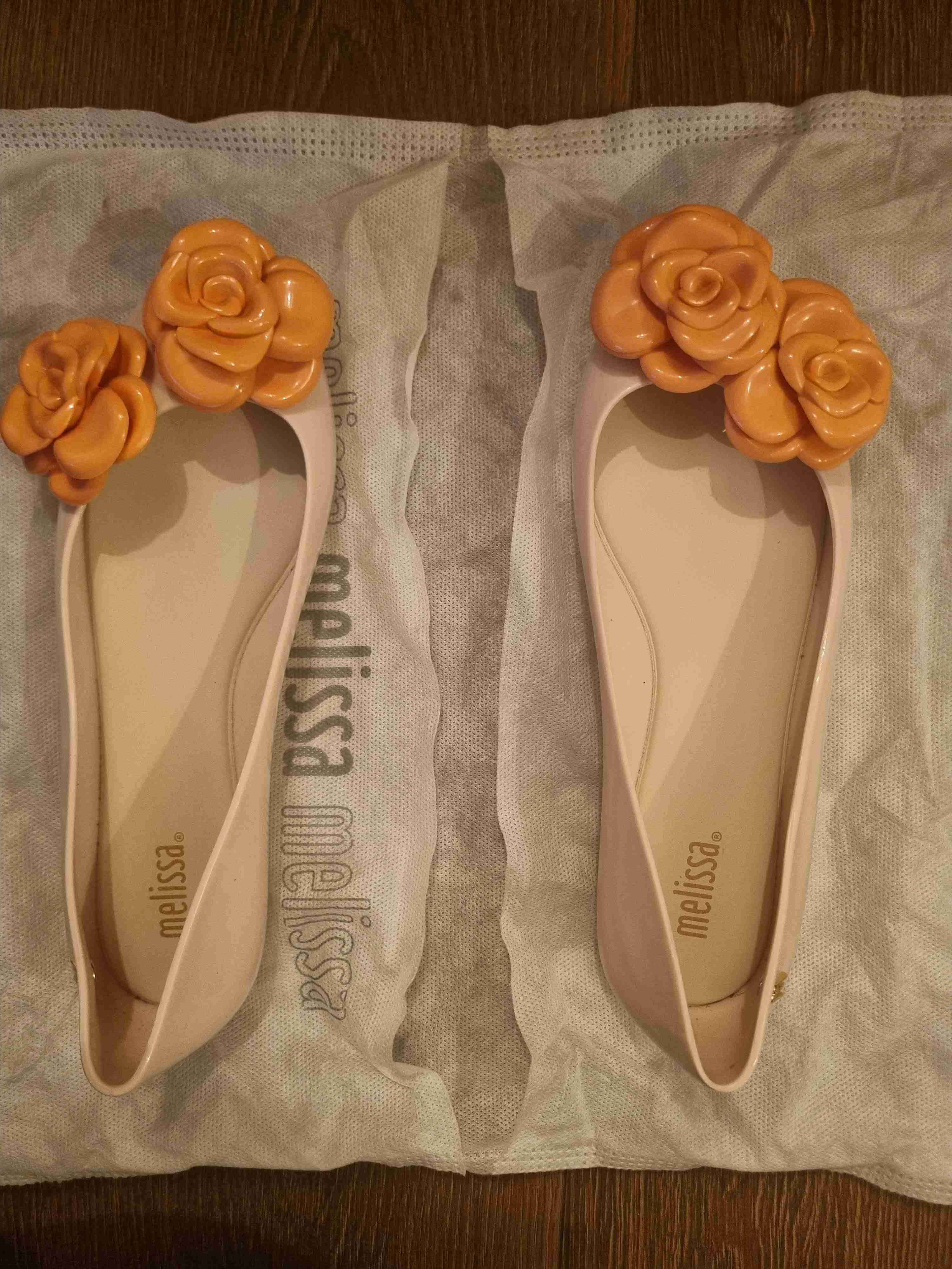 Zapatos planos beige con flores naranjas en la punta. Elegantes y en buen estado, un solo uso.