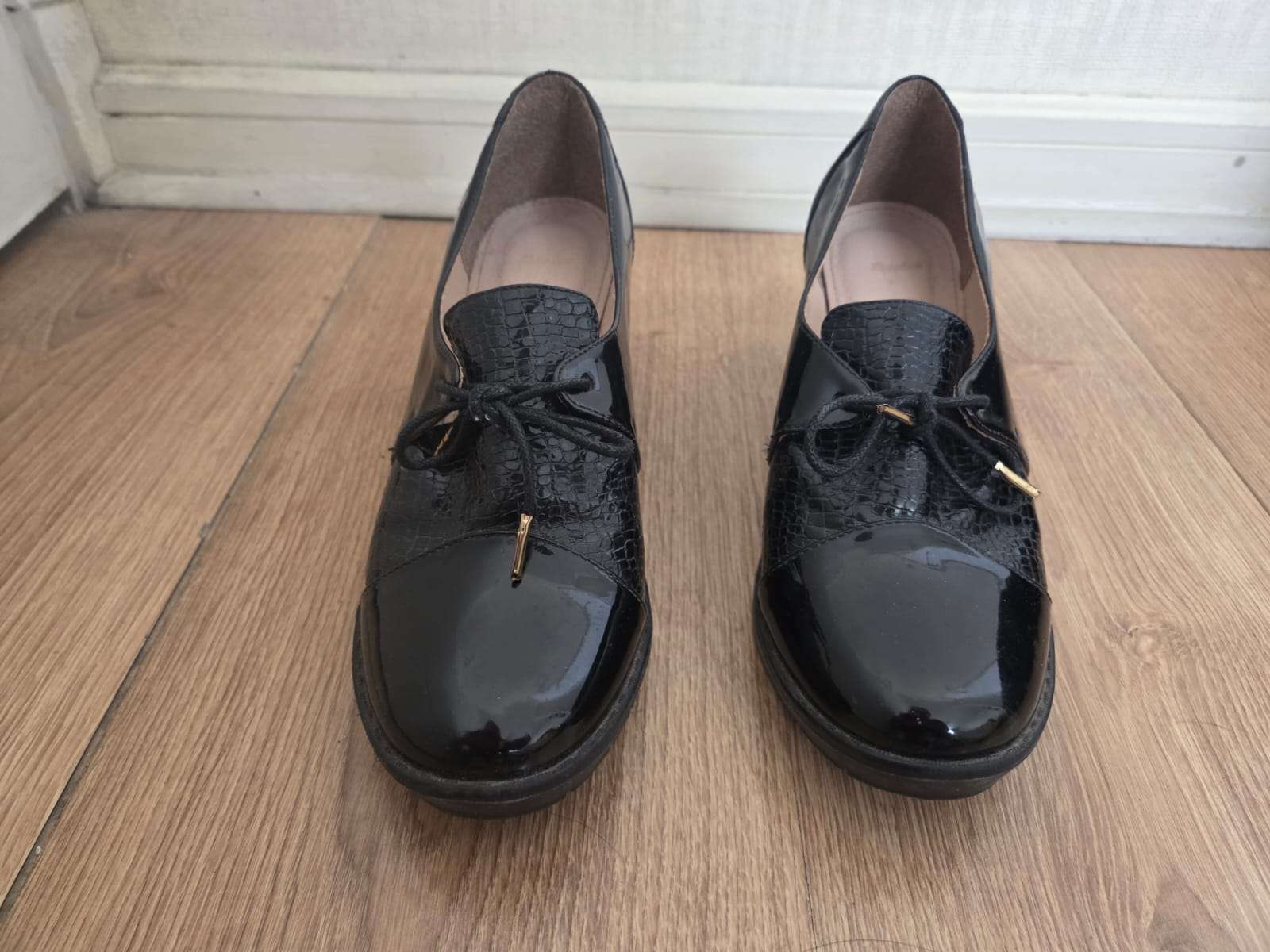Elegantes zapatos de charol negro, perfectos para ocasiones formales. En buen estado, con detalles mínimos de uso. Talla 37