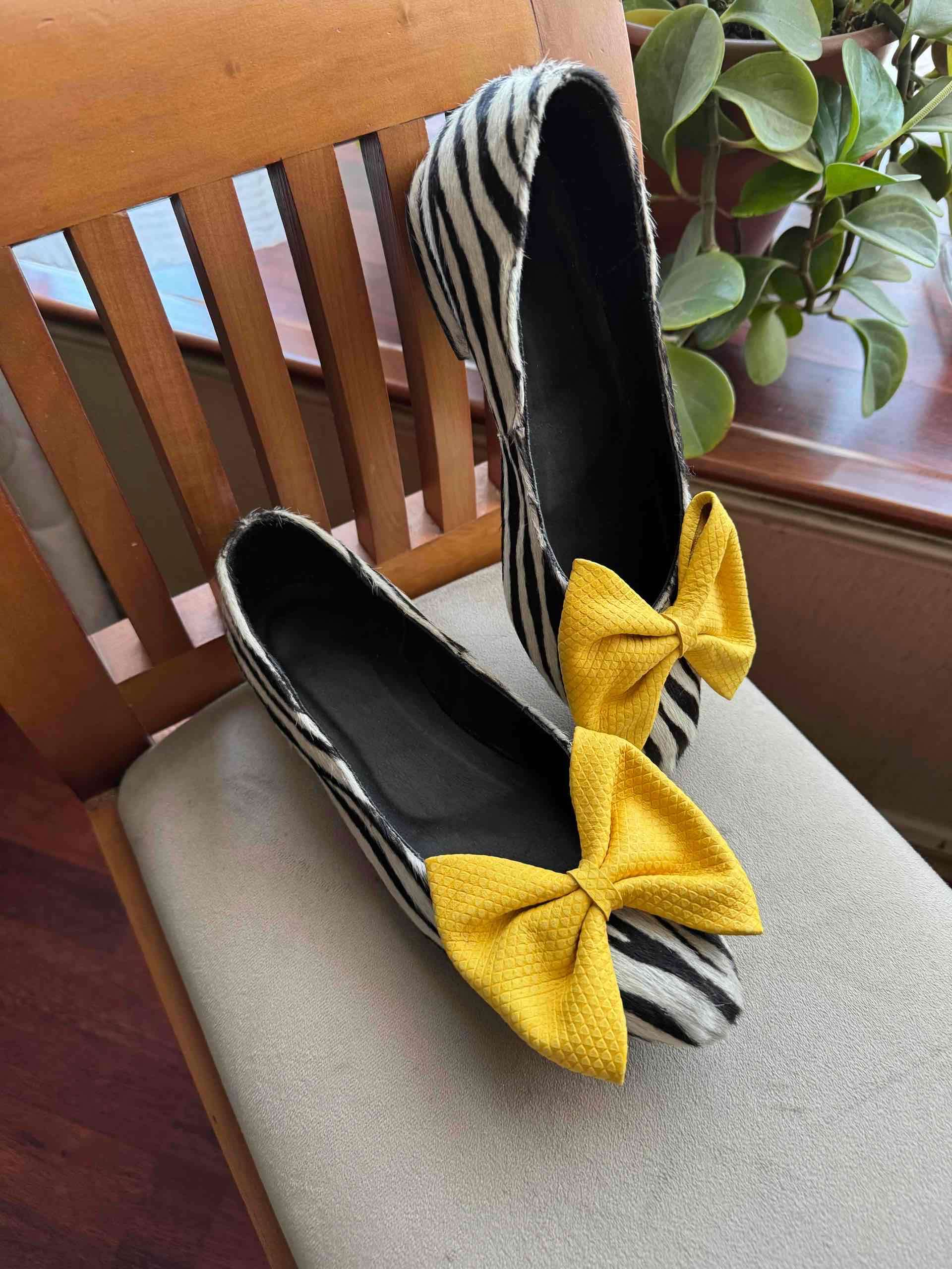 Zapatos planos de rayas en blanco y negro con lazo intercambiables, amarilo, verde y rojo. En buen estado, ideales para un look casual y único.