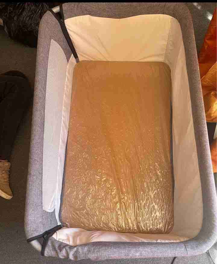 Cuna para bebé en buen estado, color gris, con malla lateral. Ideal para recién nacidos.