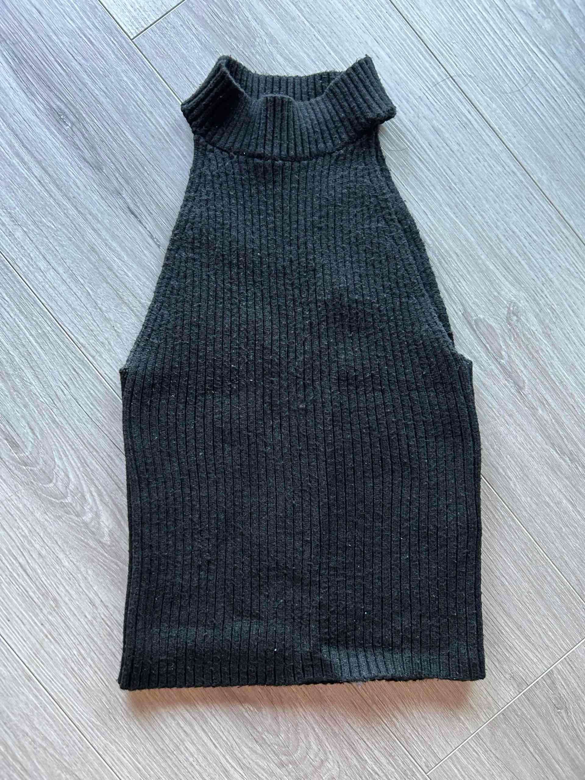 Top sin mangas de tejido negro, perfecto para combinar con jeans o faldas. En buen estado, ideal para el entretiempo.