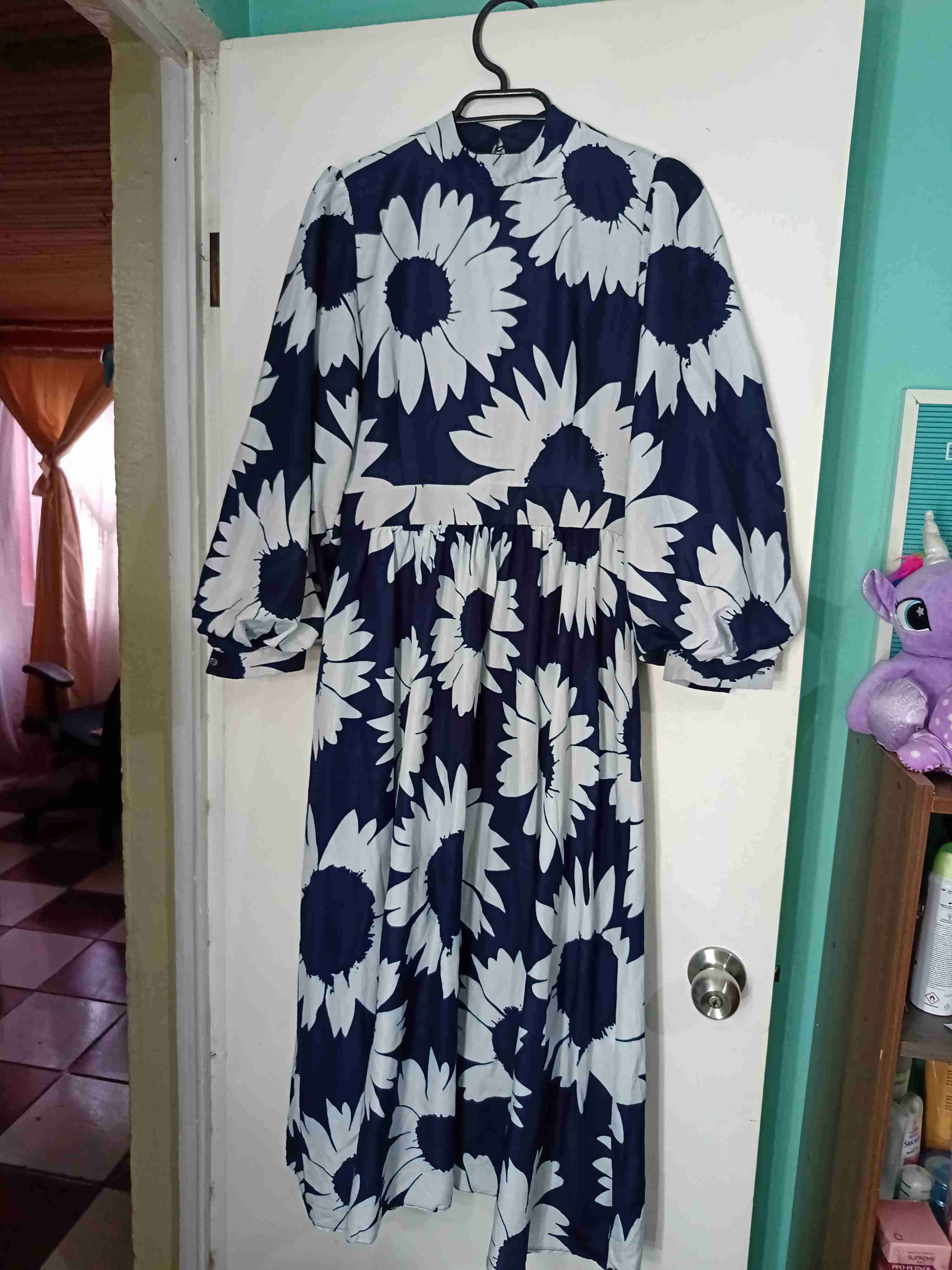 Vestido largo con estampado de flores grandes en azul y blanco. Ideal para ocasiones casuales o eventos veraniegos. Manga globo.