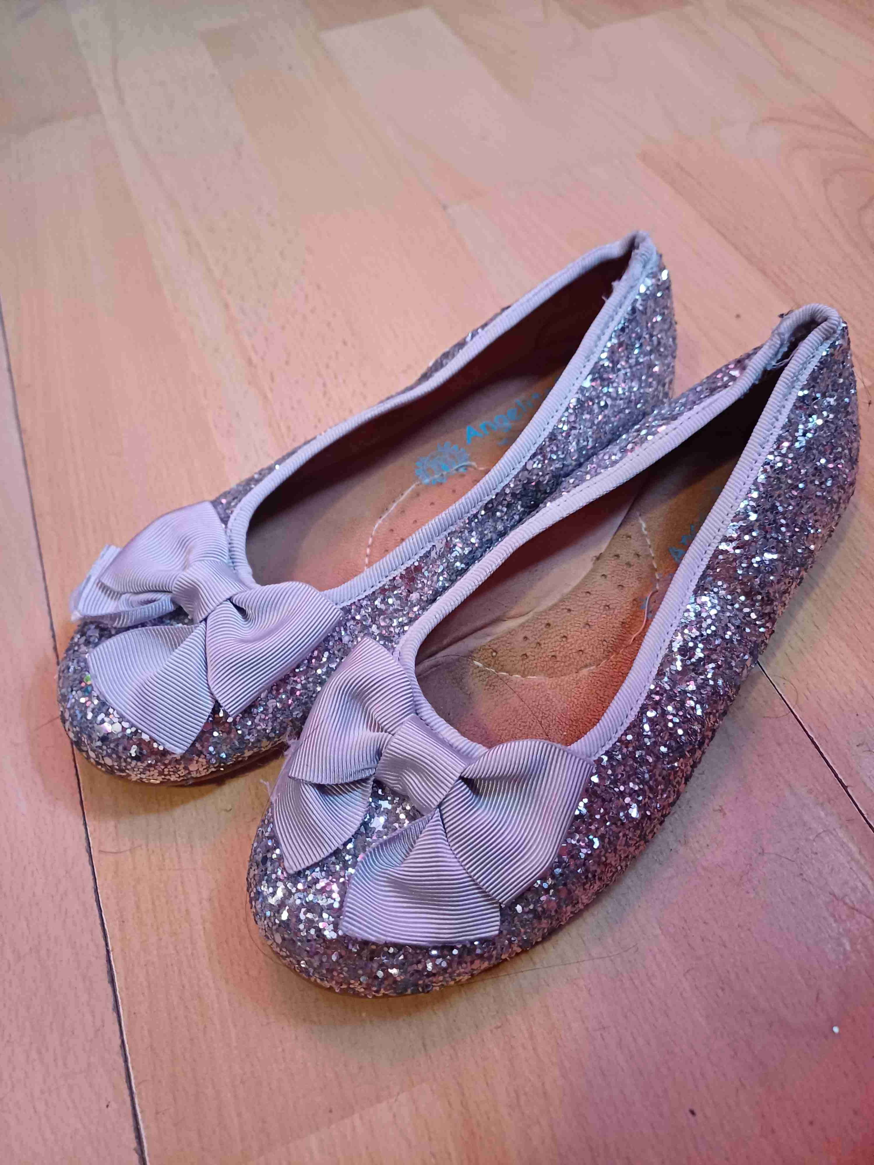 Hermosas ballerinas con brillo plateado y detalle de lazo. Perfectas para ocasiones especiales. En buen estado.talla 34 marca angelitos ( marca española)