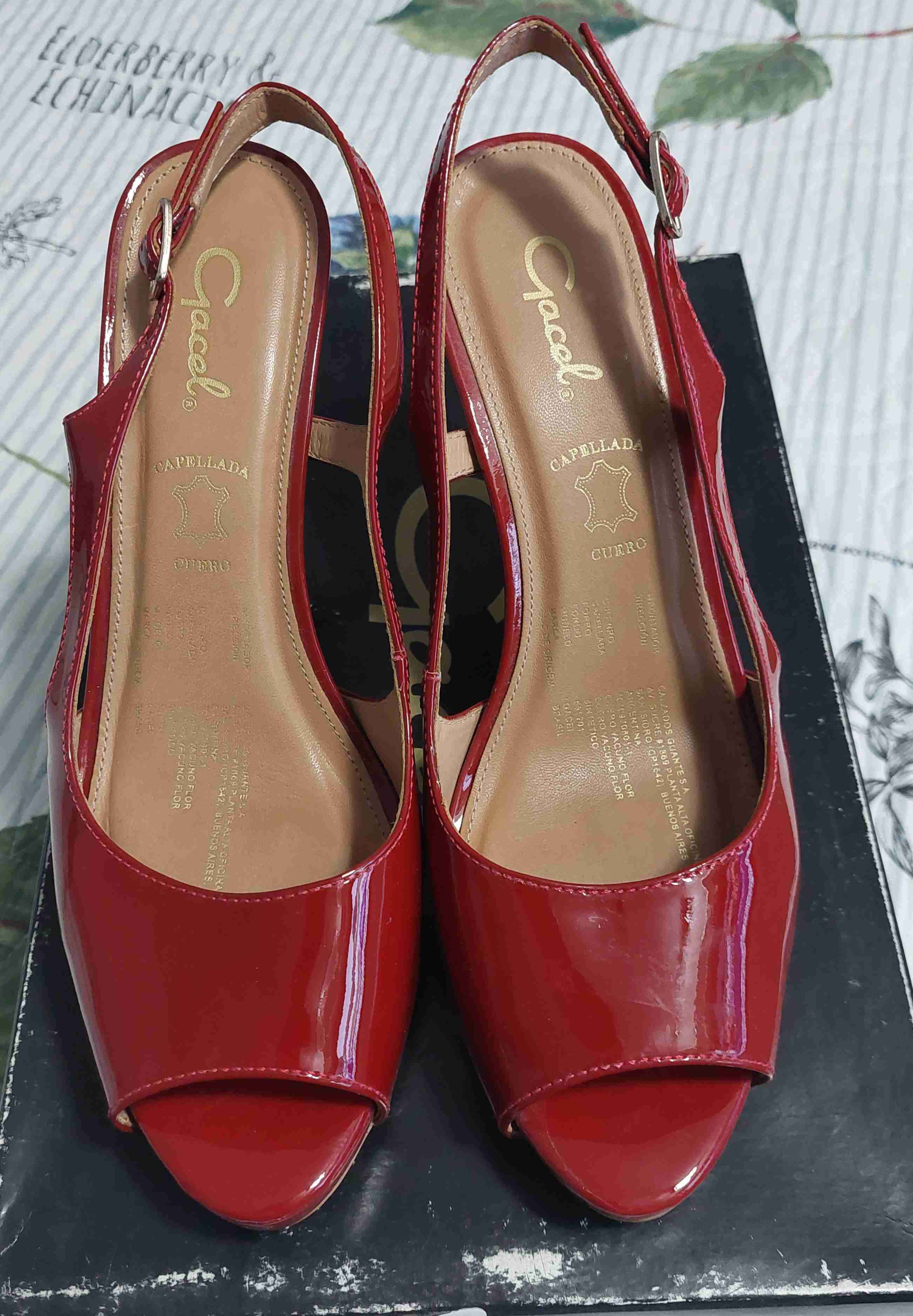 Elegantes zapatos de tacón rojo en charol, ideales para eventos formales. En buen estado, usados levemente.