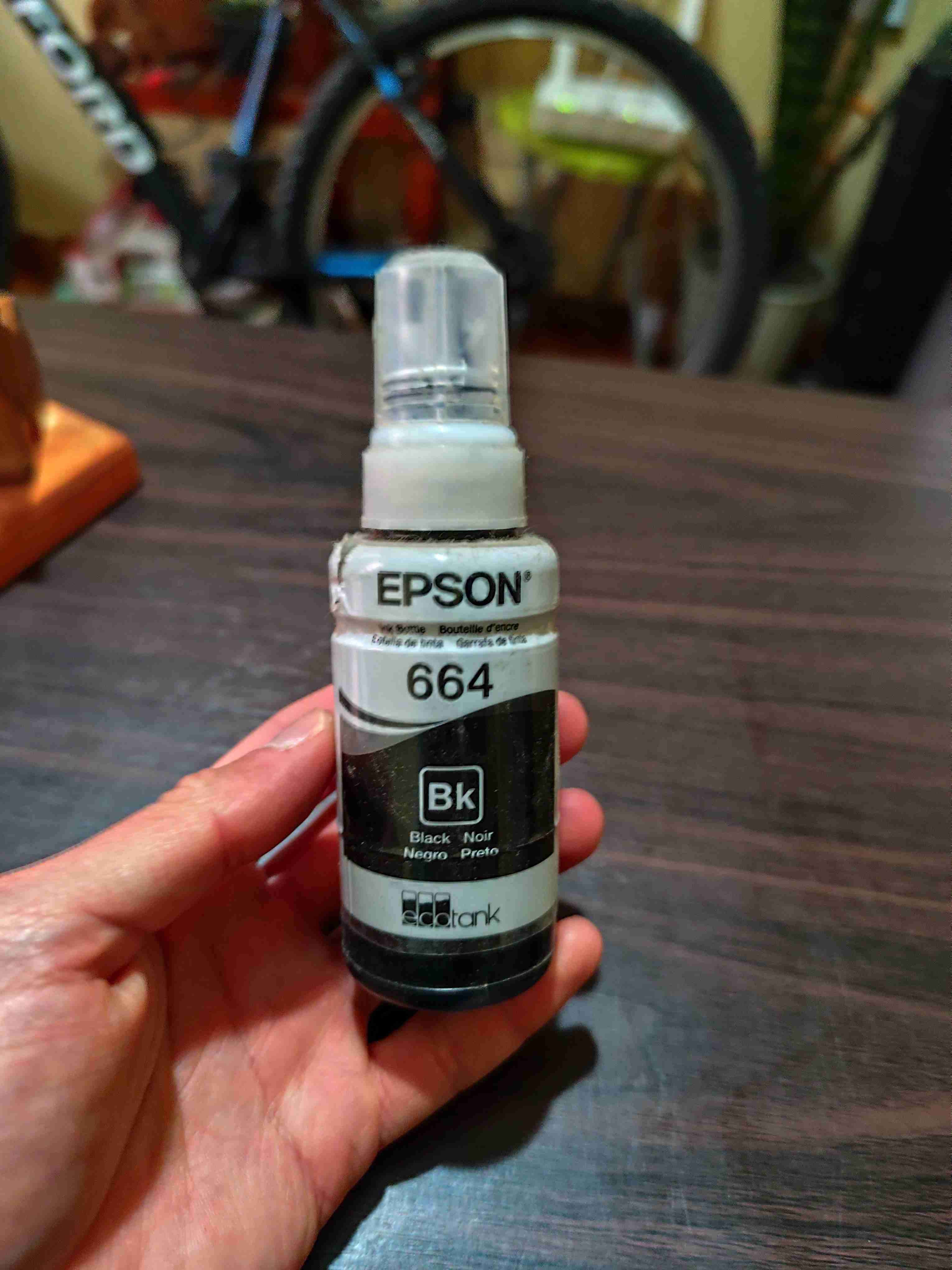 Botella de tinta negra Epson 664, ideal para impresoras Ecotank. Buen estado, lista para usar.