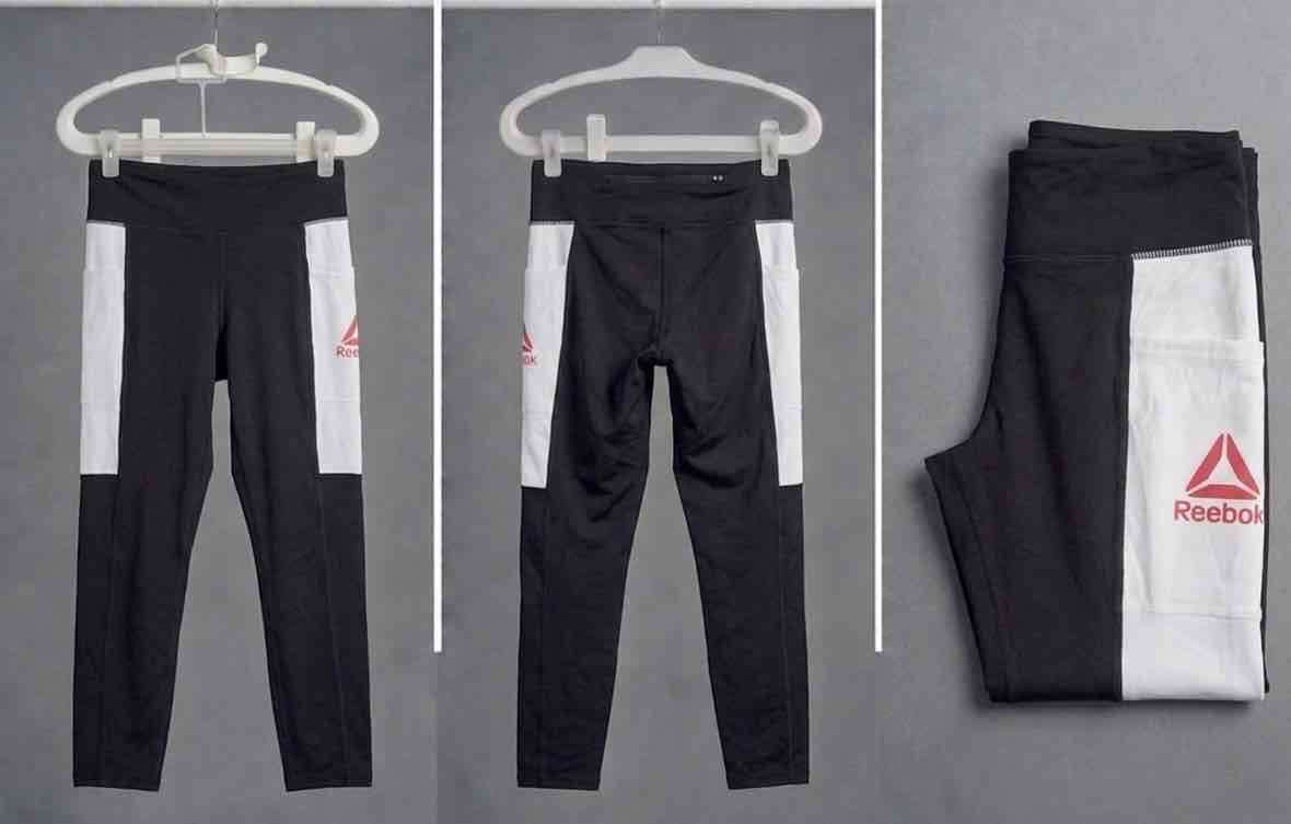 Cómodos leggings deportivos, ideales para entrenamiento. En buen estado general, color negro con detalles blancos y logo Reebok.