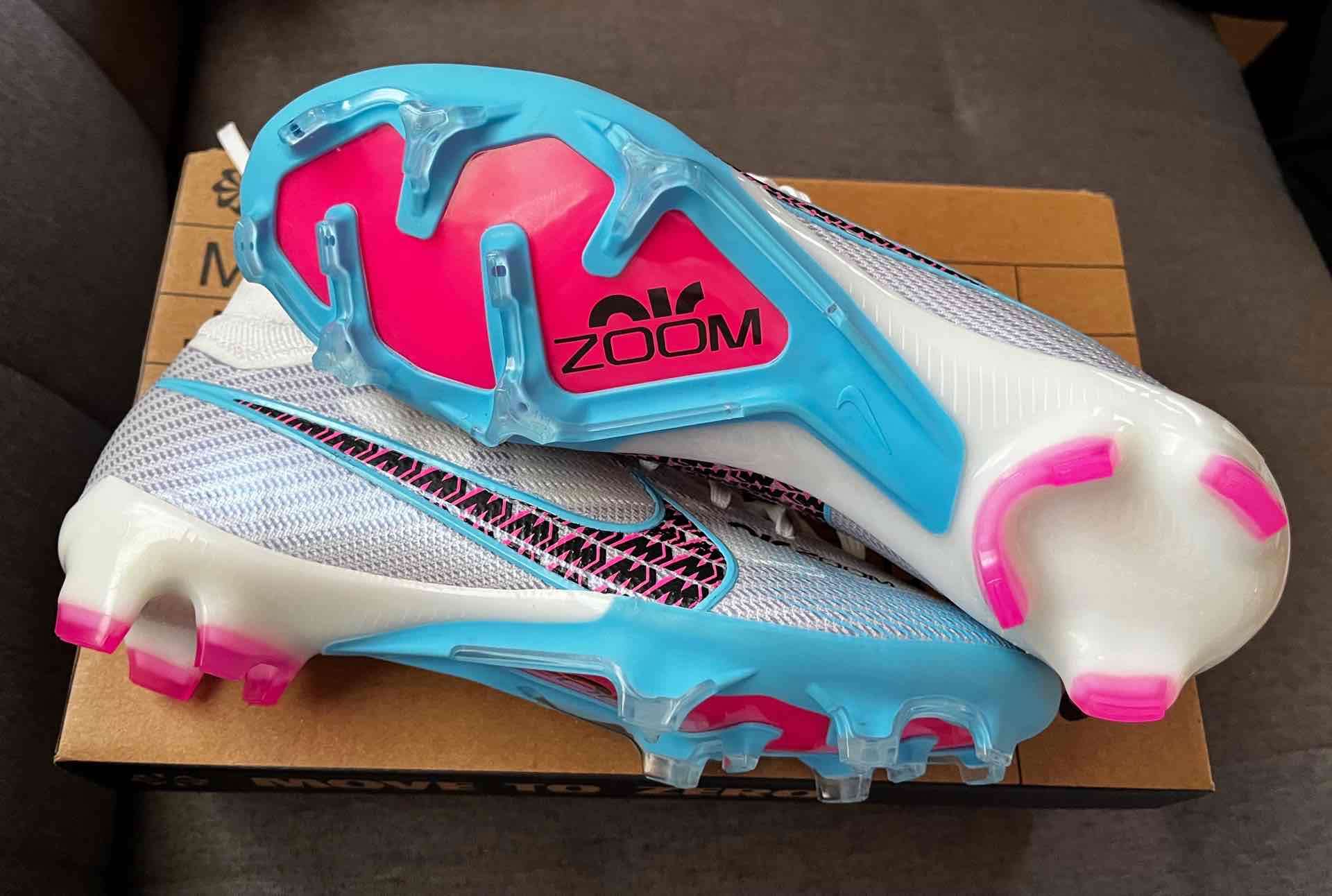 Botines de fútbol con diseño moderno en colores blanco, azul y rosado. Ideales para canchas de césped. En buen estado.