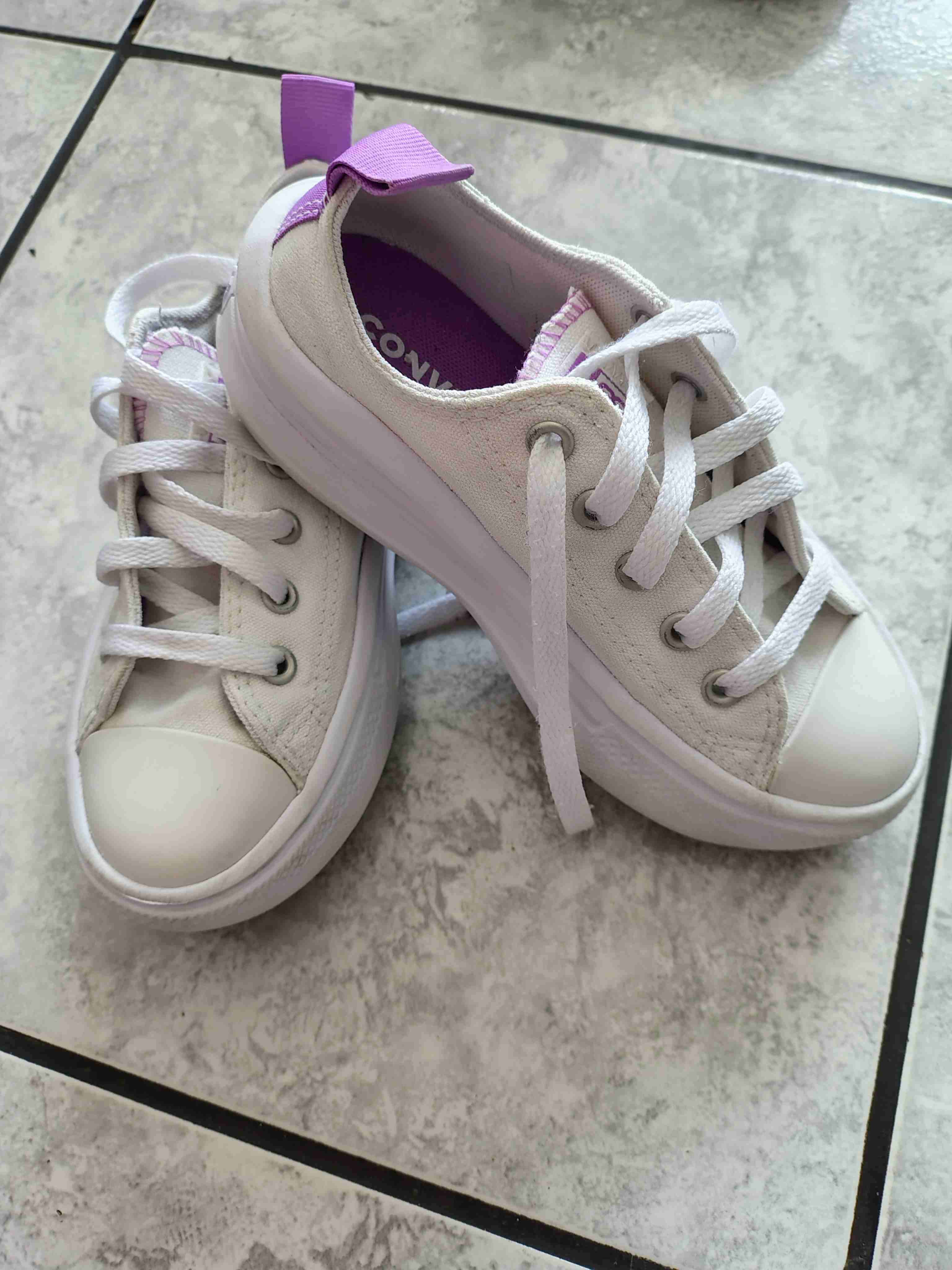 Zapatillas casuales blancas con detalles lilas y suela gruesa. Buen estado, ideal para el uso diario.n°30