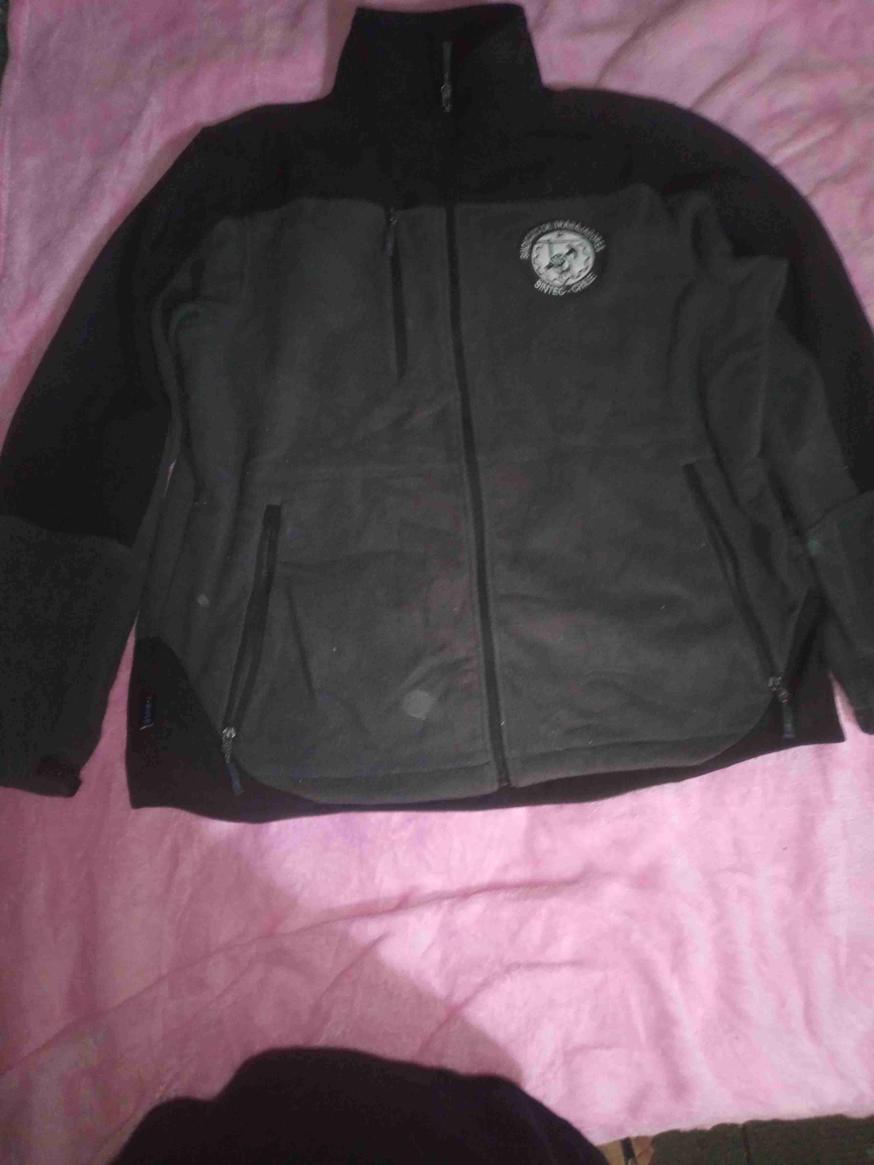 Chaqueta de polar negra con cremallera y logo. Ideal para el frío, en buen estado con leves señales de uso.