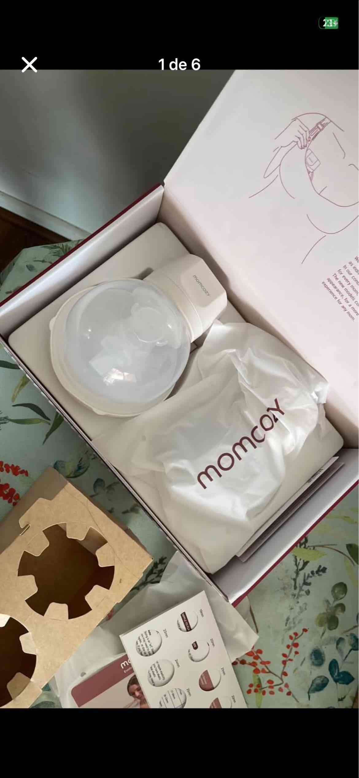 Extractor de leche Momcozy en caja original, ideal para mamás lactantes. En excelente estado, con accesorios incluidos.