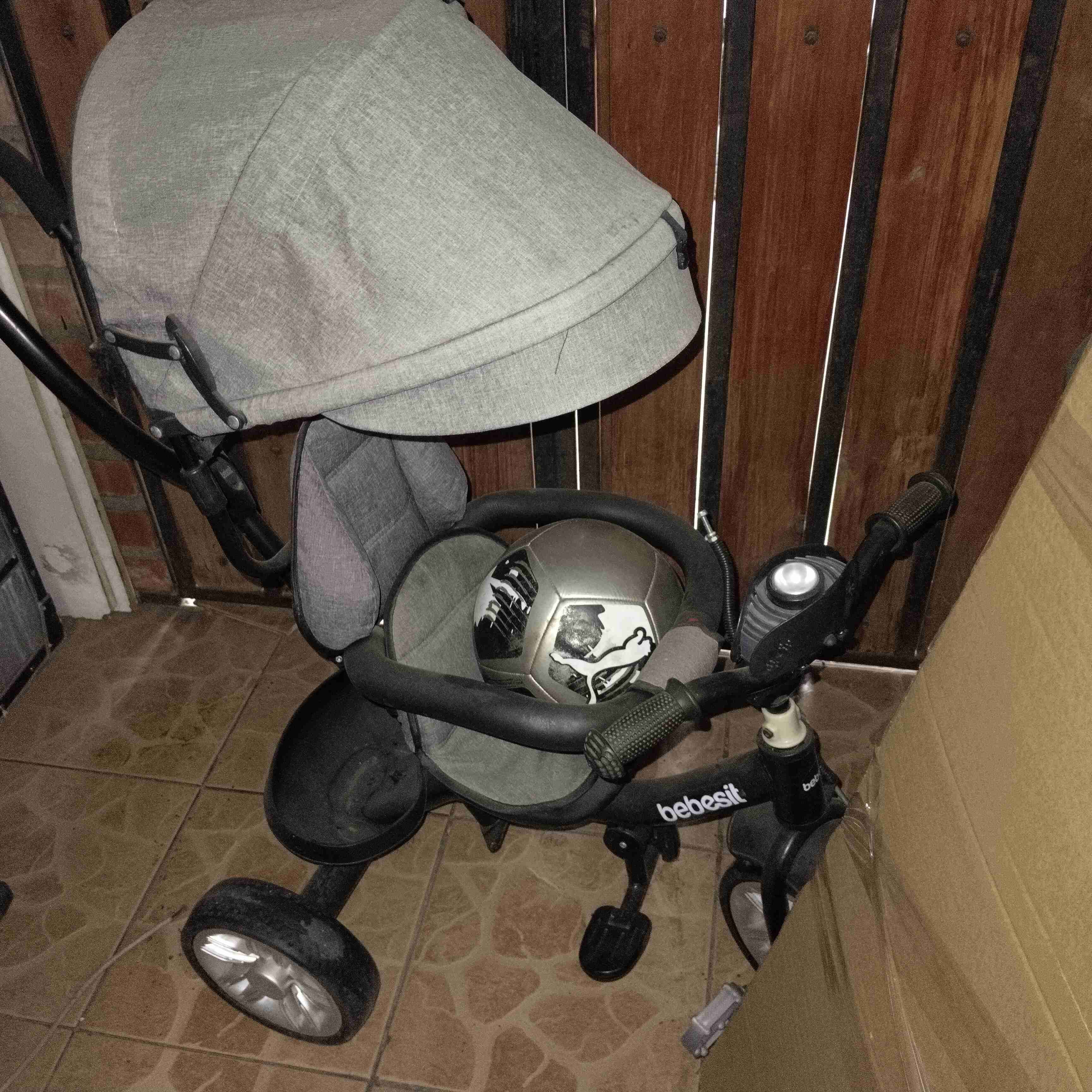 Triciclo para bebé en buen estado, color gris. Ideal para paseos cómodos y seguros.