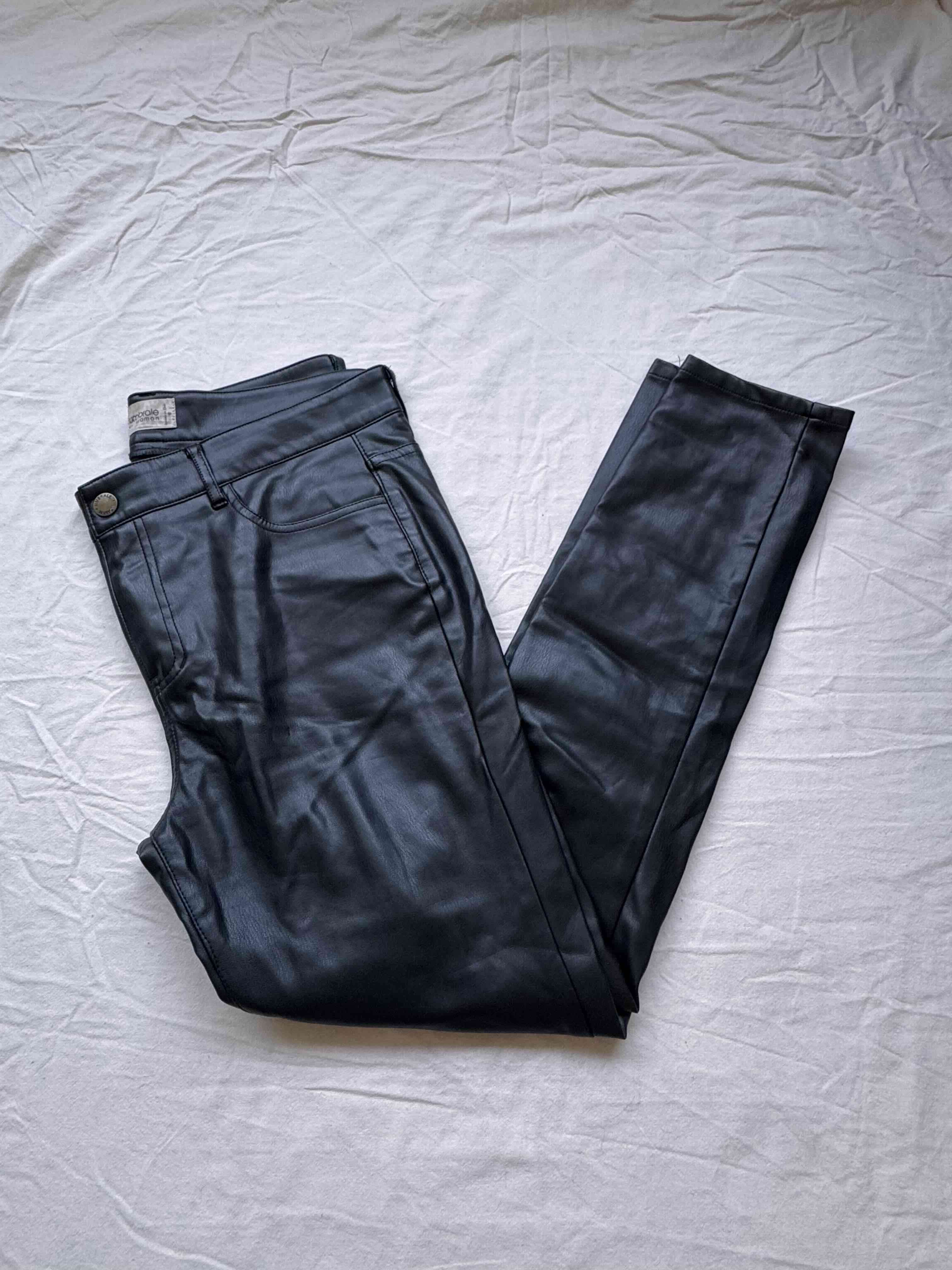 Pantalones ajustados de cuero sintético en negro, ideales para un look moderno y desenfadado. En buen estado.