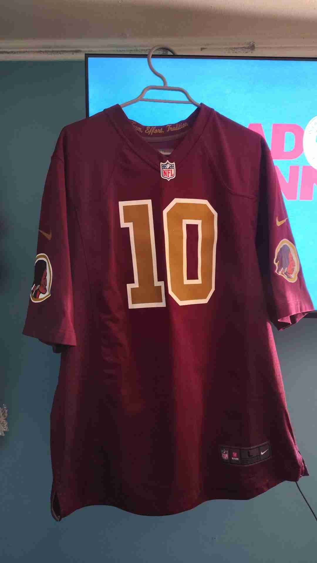 Camiseta deportiva NFL color rojo burdeos, ideal para fanáticos del fútbol americano. En buen estado, muestra signos leves de uso. Talla L Poco uso Se mantiene el color perfecto