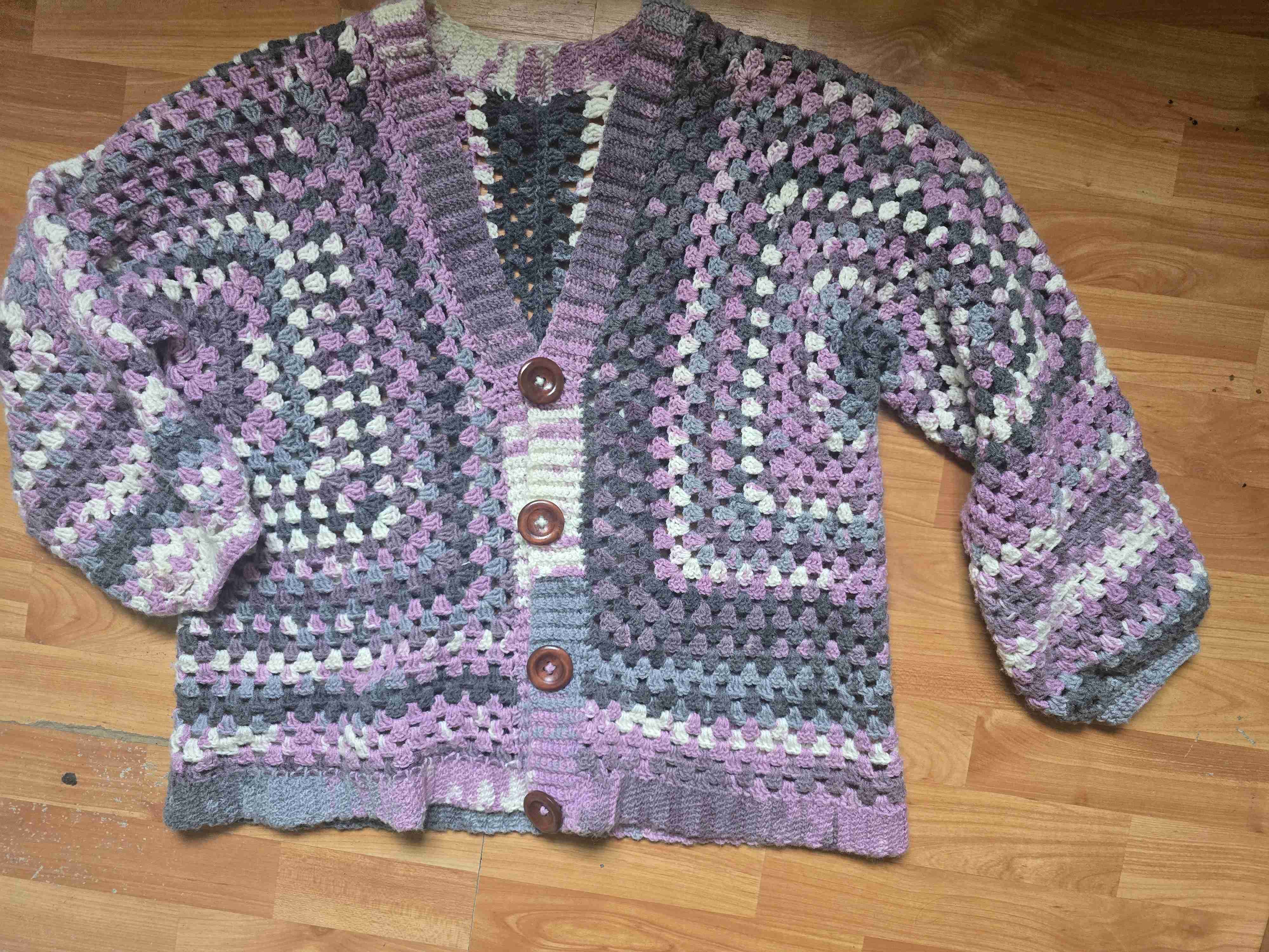 Cardigan en tonos lilas y grises, ideal para el invierno. En buen estado con botones grandes al frente.