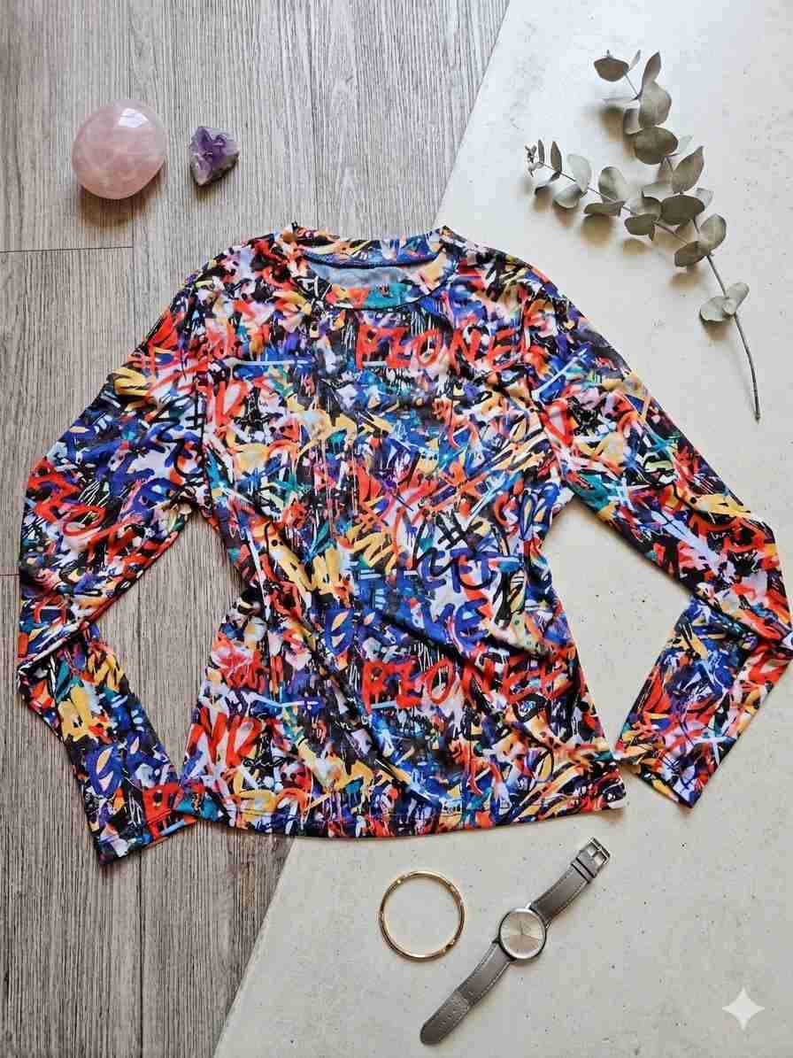 Polera de manga larga con diseño abstracto multicolor. Ideal para un estilo casual y moderno. En buen estado con uso ligero.