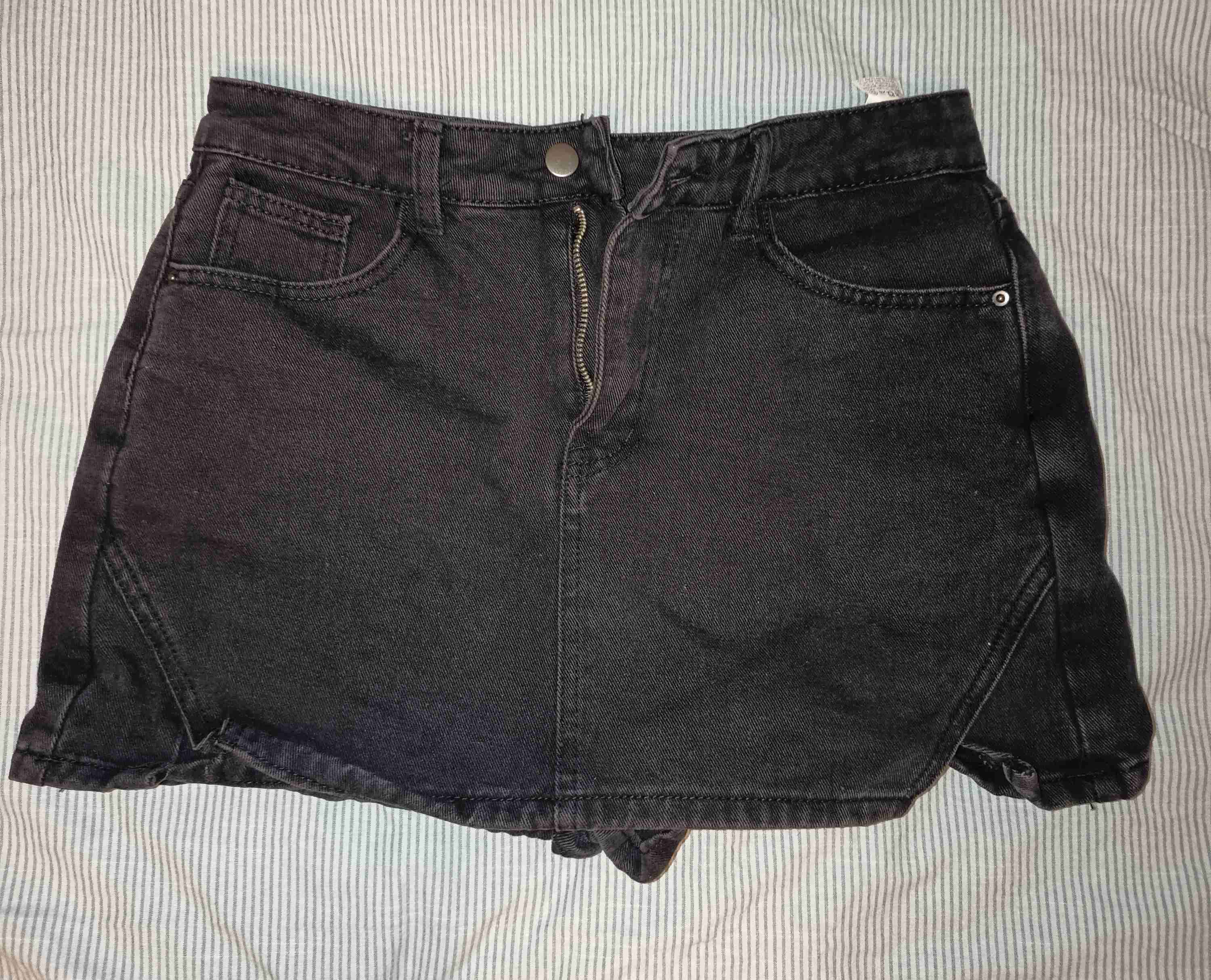 Falda corta de mezclilla negra, ideal para el verano. Está en buen estado con ligeros signos de uso.