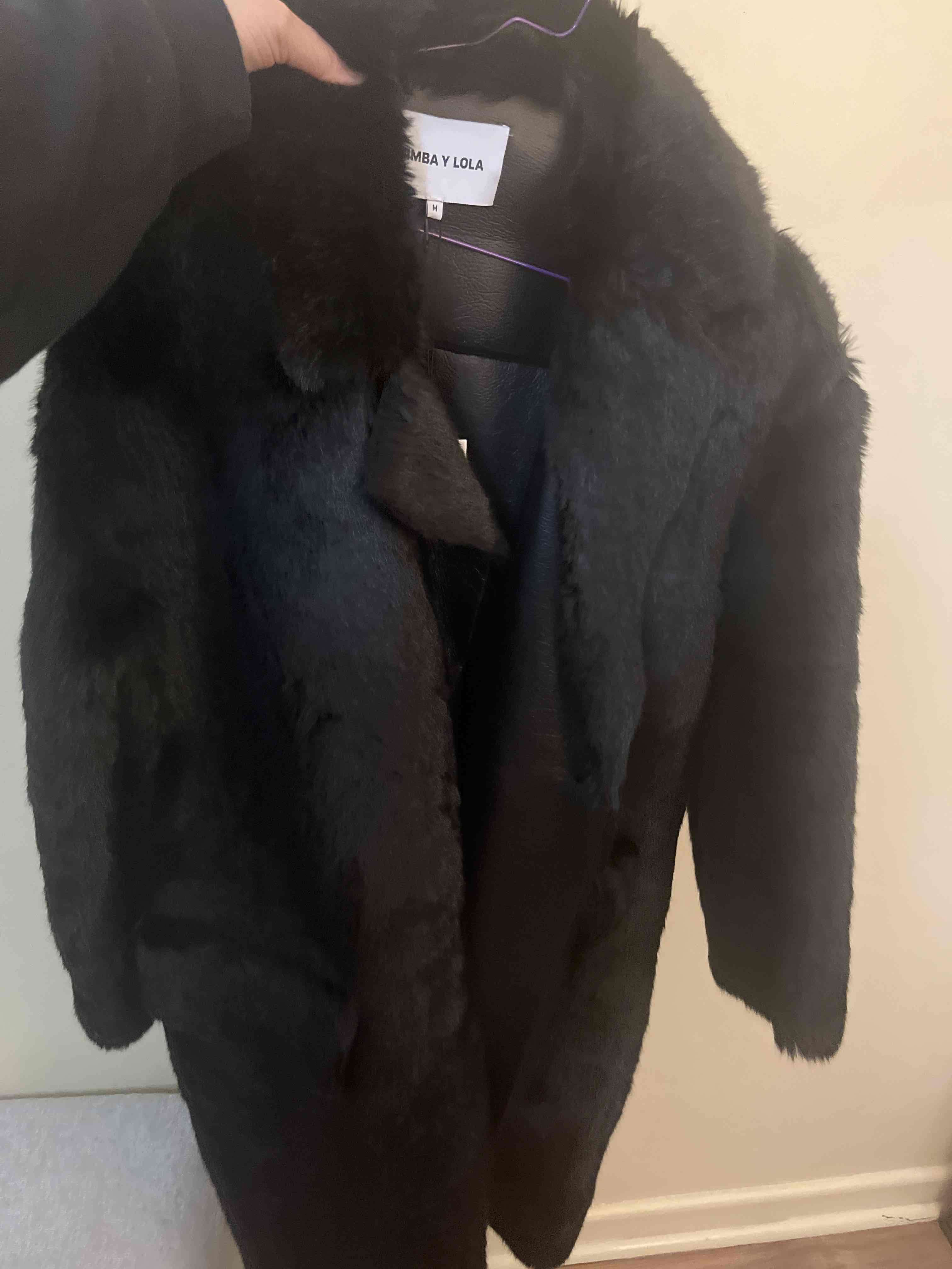 Elegante abrigo de piel sintética negro, ideal para el invierno. Está en buen estado. Nuevo talla M