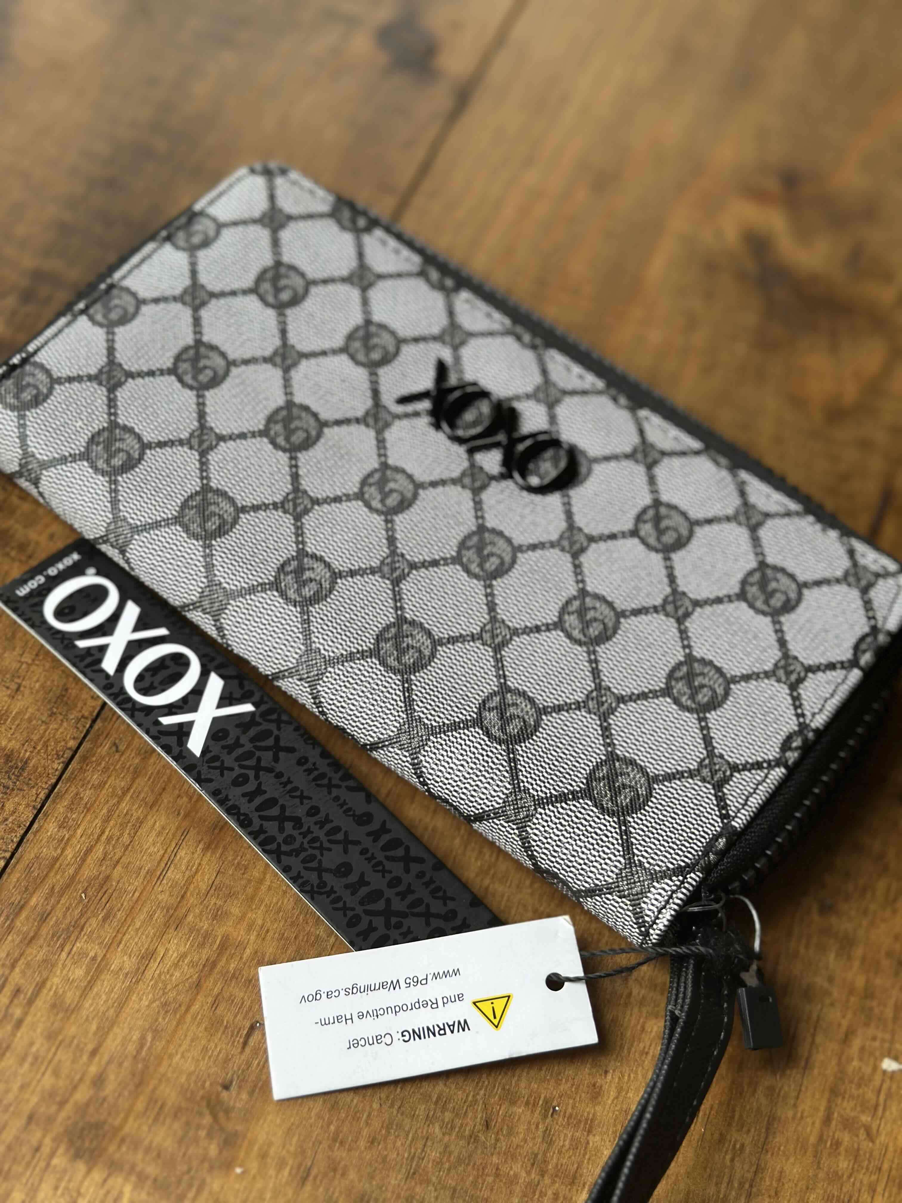 Elegante monedero gris con patrón geométrico. Perfecto para llevar tus tarjetas y billetes. En excelente estado, viene con etiqueta.