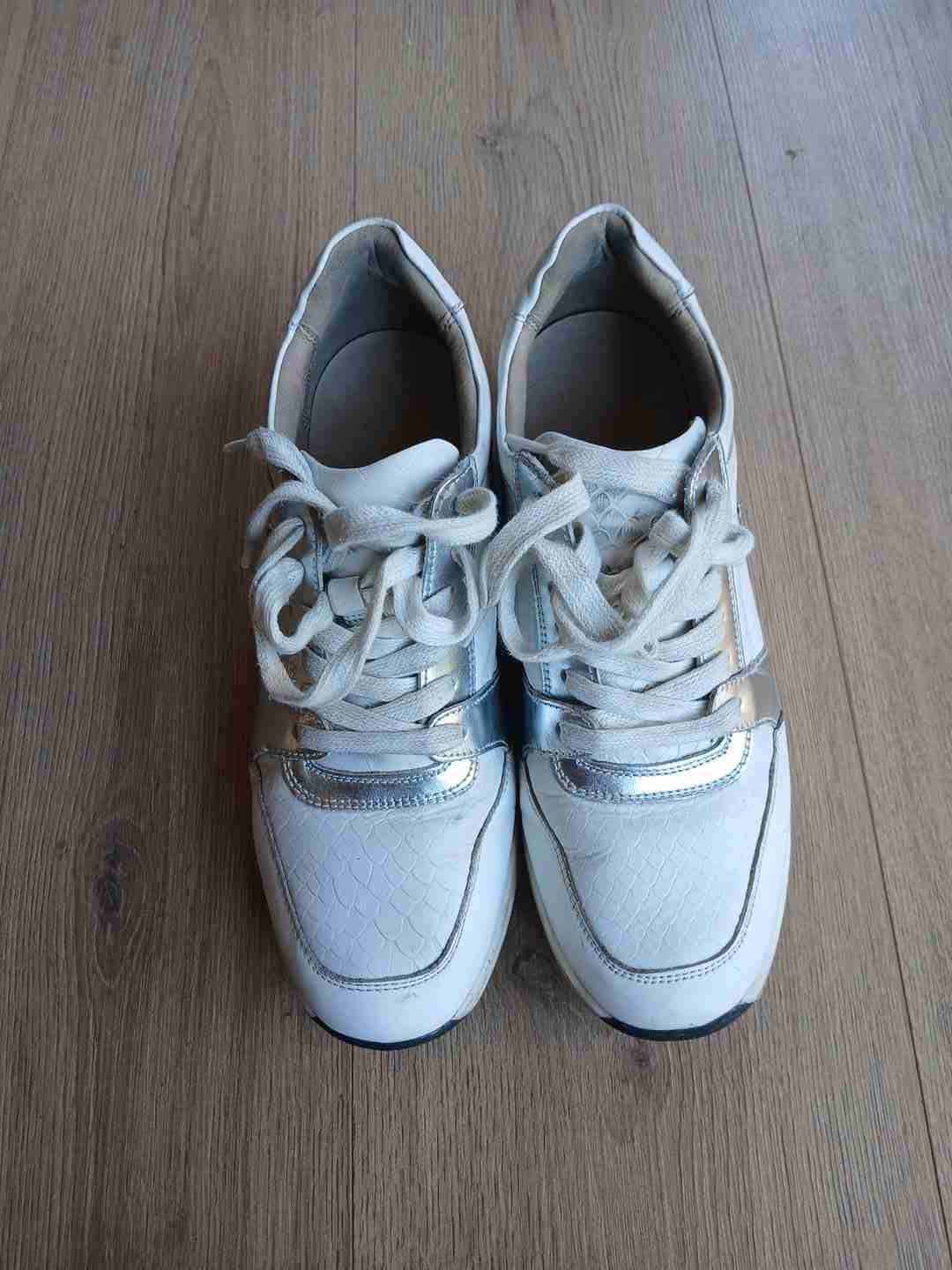 Zapatillas blancas con detalles metálicos. En buen estado, perfectas para el uso diario. Son 16 hrs. Están en muy buenas condiciones.