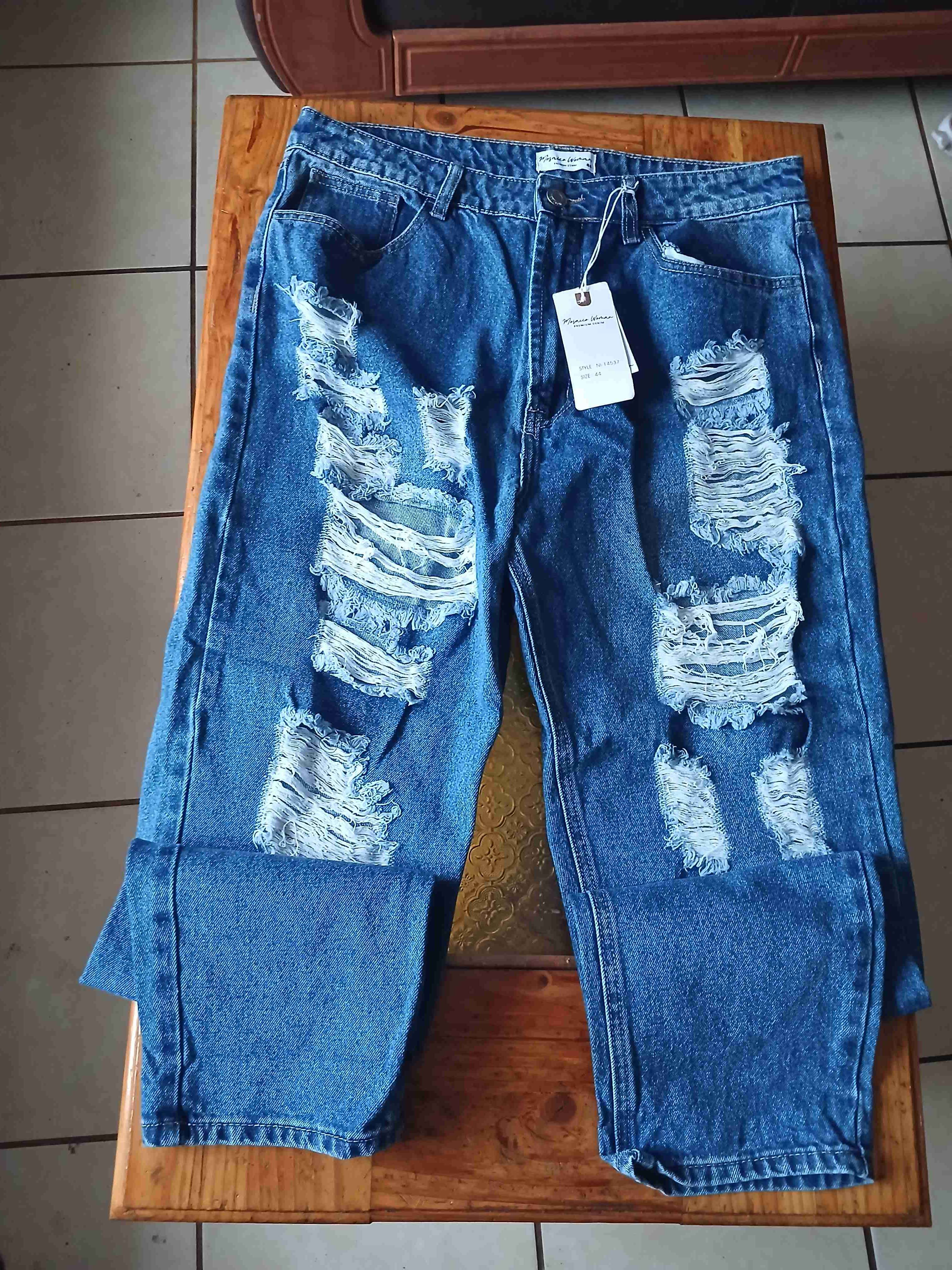 Jeans azules con estilo desgastado y rotos, ideal para un look casual y moderno.