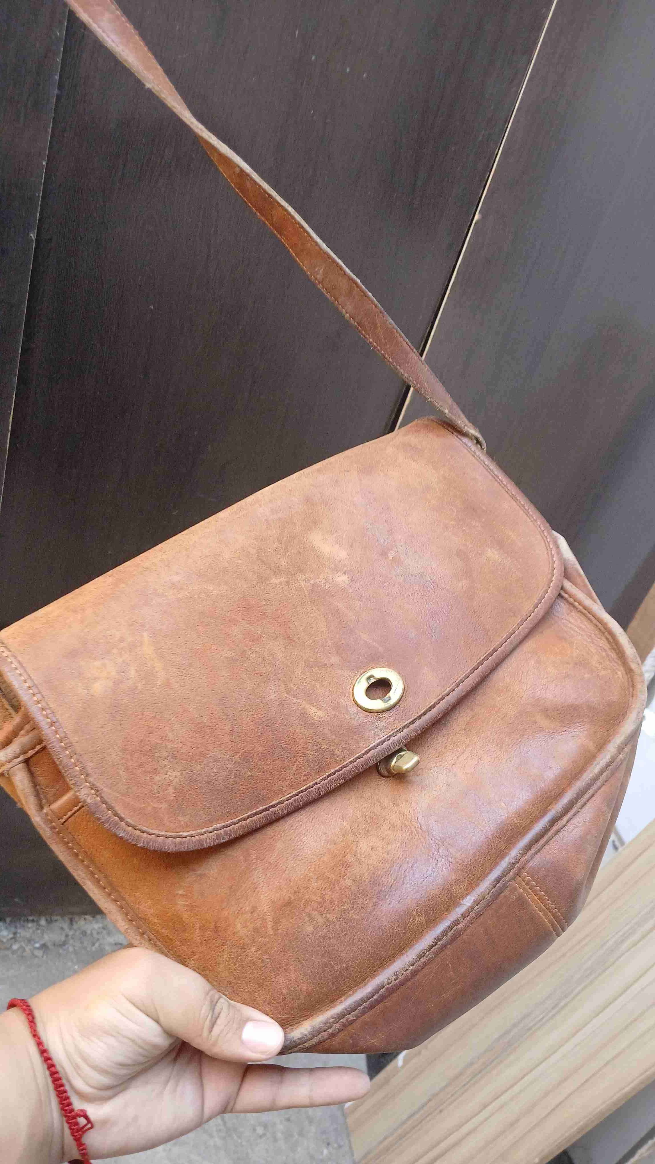 Bolso bandolera de cuero marrón, estilo vintage. Ideal para uso diario con signos de uso visibles.