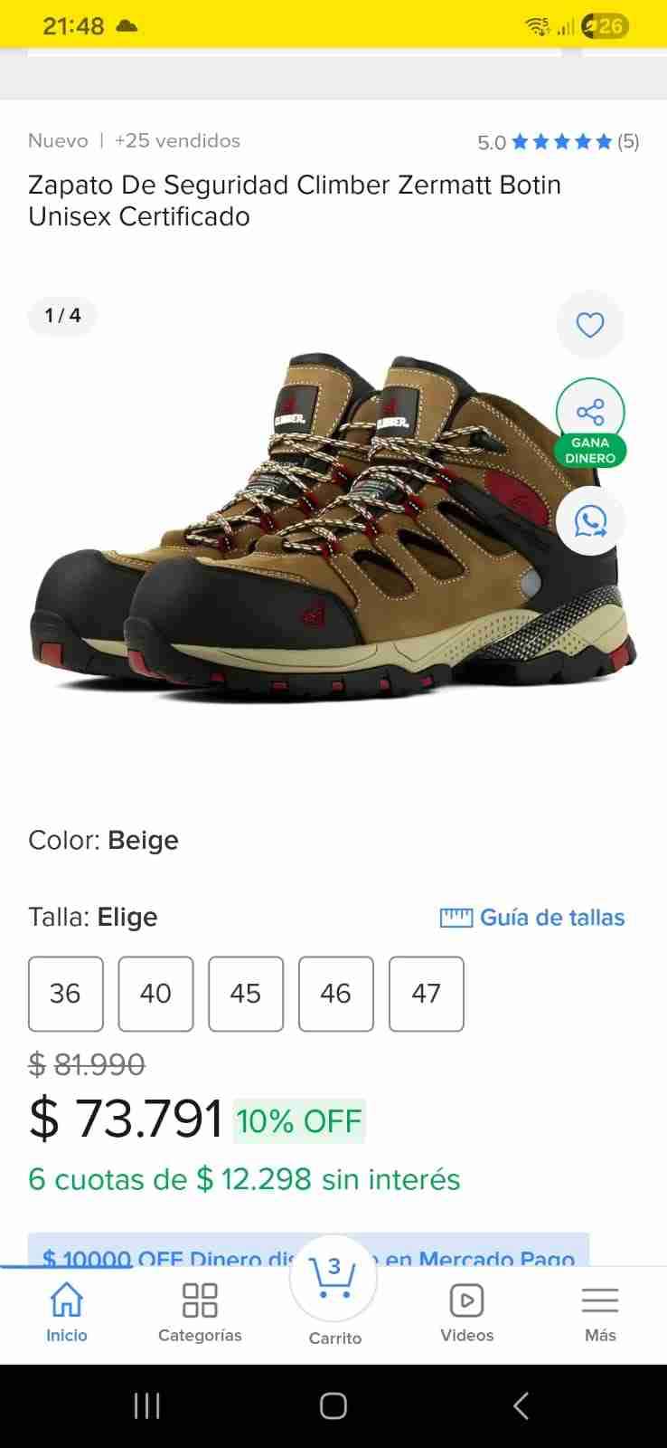 Botines de seguridad certificados, color beige, ideales para trabajo en exteriores. Nueva condición, nunca usados.
