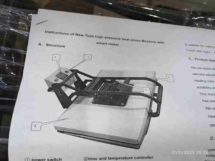 Máquina de prensa térmica para estampados, ideal para personalizar ropa y objetos. Incluye controlador de temperatura y tiempo.