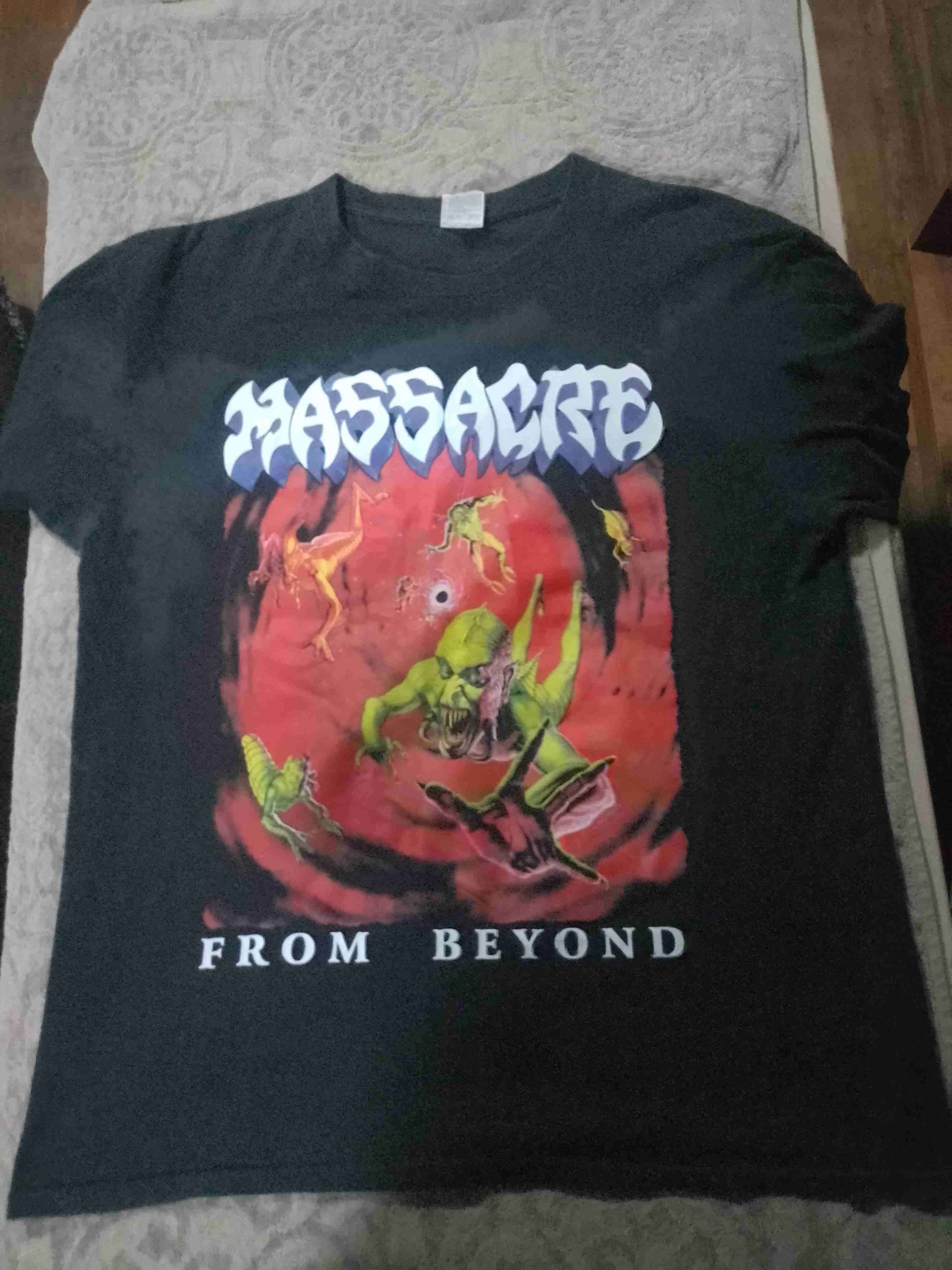 Polera negra con estampado de la banda Massacre, estilo rockero. En buen estado, ideal para fanáticos.