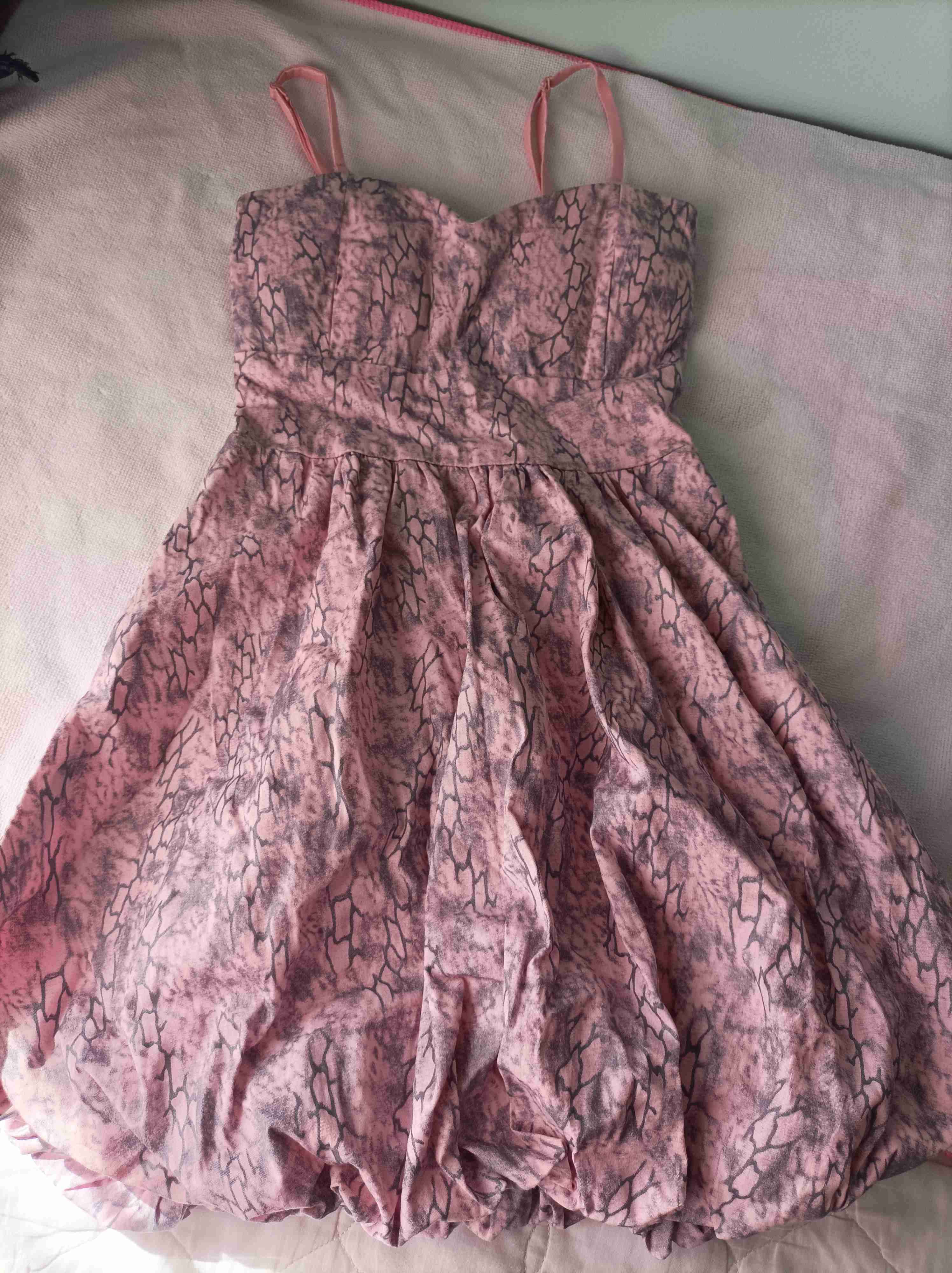 Vestido corto rosa con estampado elegante, perfecto para ocasiones especiales. En buen estado general.
