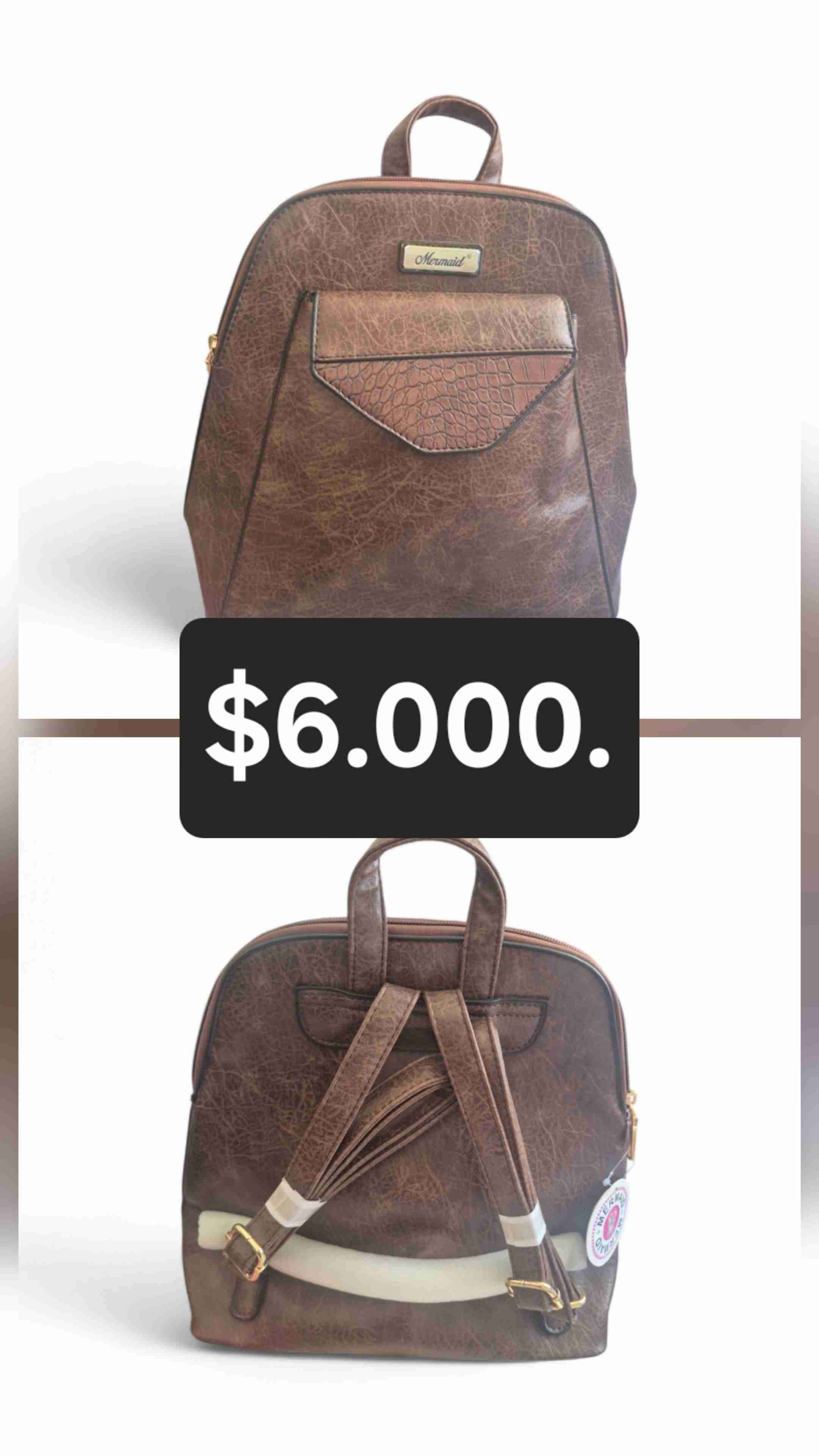 Mochila de cuero sintético marrón con detalle de textura tipo cocodrilo. Ideal para el uso diario. En buen estado con signos leves de uso.