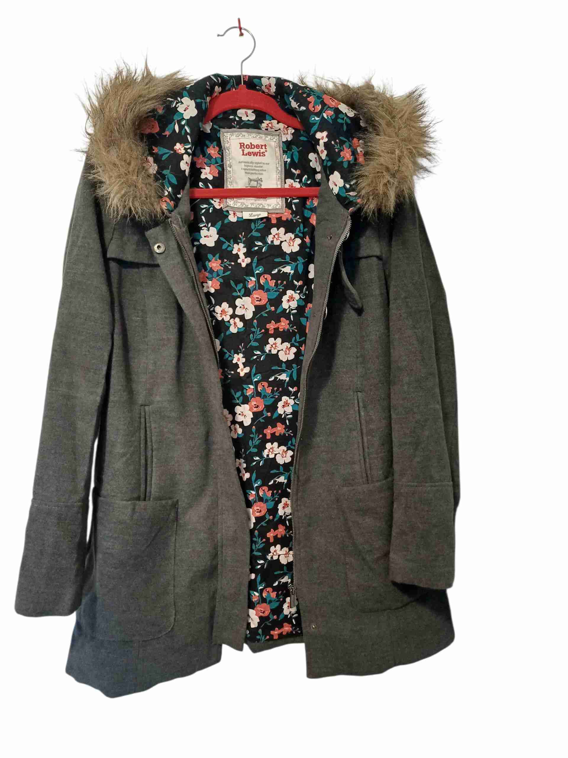 Abrigo estilo montgomery gris con capucha y forro interno floral. Ideal para el invierno, en buen estado general.