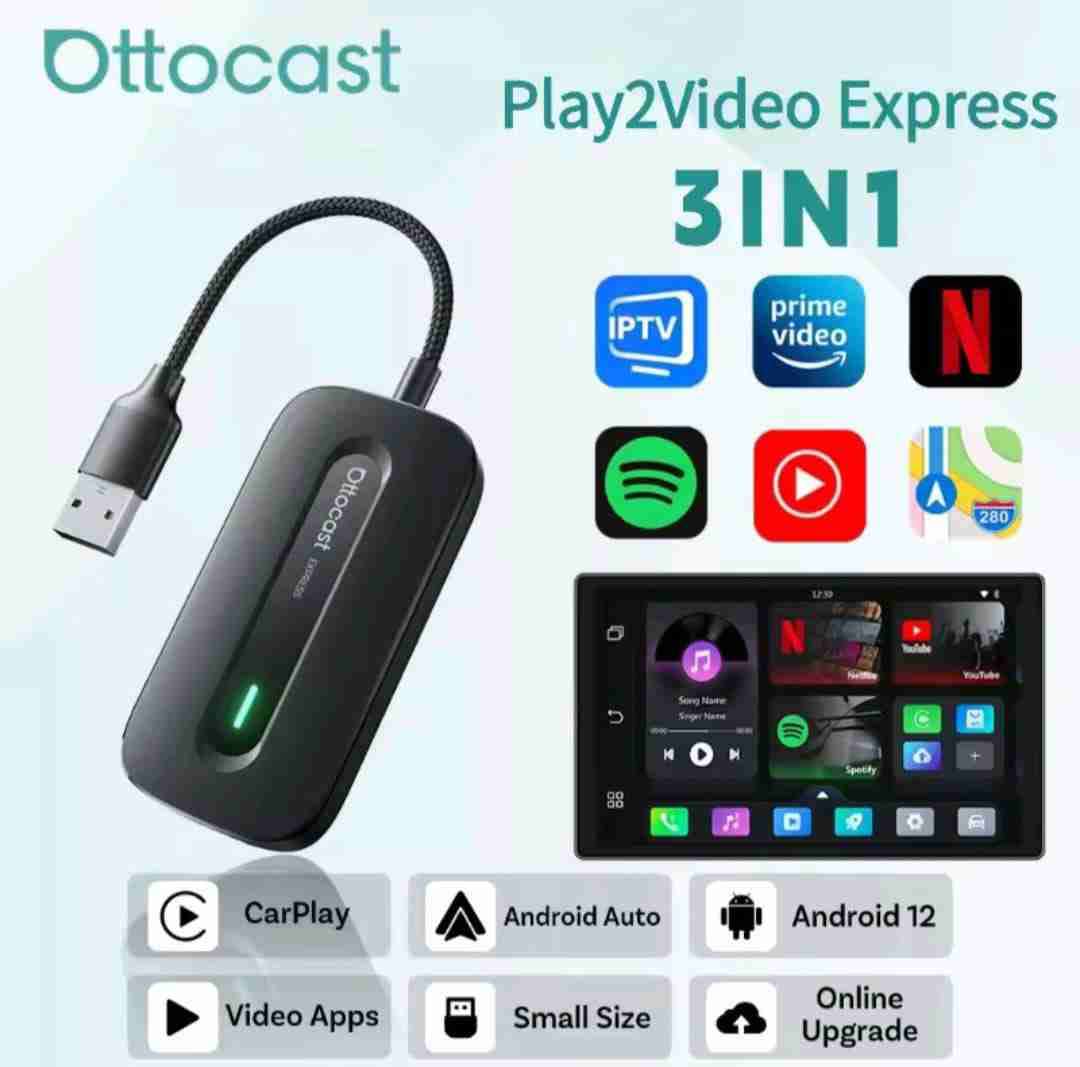 Marca Ottocast Adaptador carplay Inalámbrico 3 en 1 Apple carplay android auto y android 12 Compatible con radios con Apple carplay y android auto Memoria Ram 2GB Almacenamiento interno 16GB Ottocast play2 video express Conectividad a Bluetooth 5.4 Conectividad Wifi 5ghz Puede ponerle un pedrive de hasta 128 gb Este dispositivo carplay sirve solo si tu auto tiene radio carplay de fabrica y lo conecta por cable usb Con este disposito puede ver video en Yuo tube ,Netflix, amazon prime, iptv