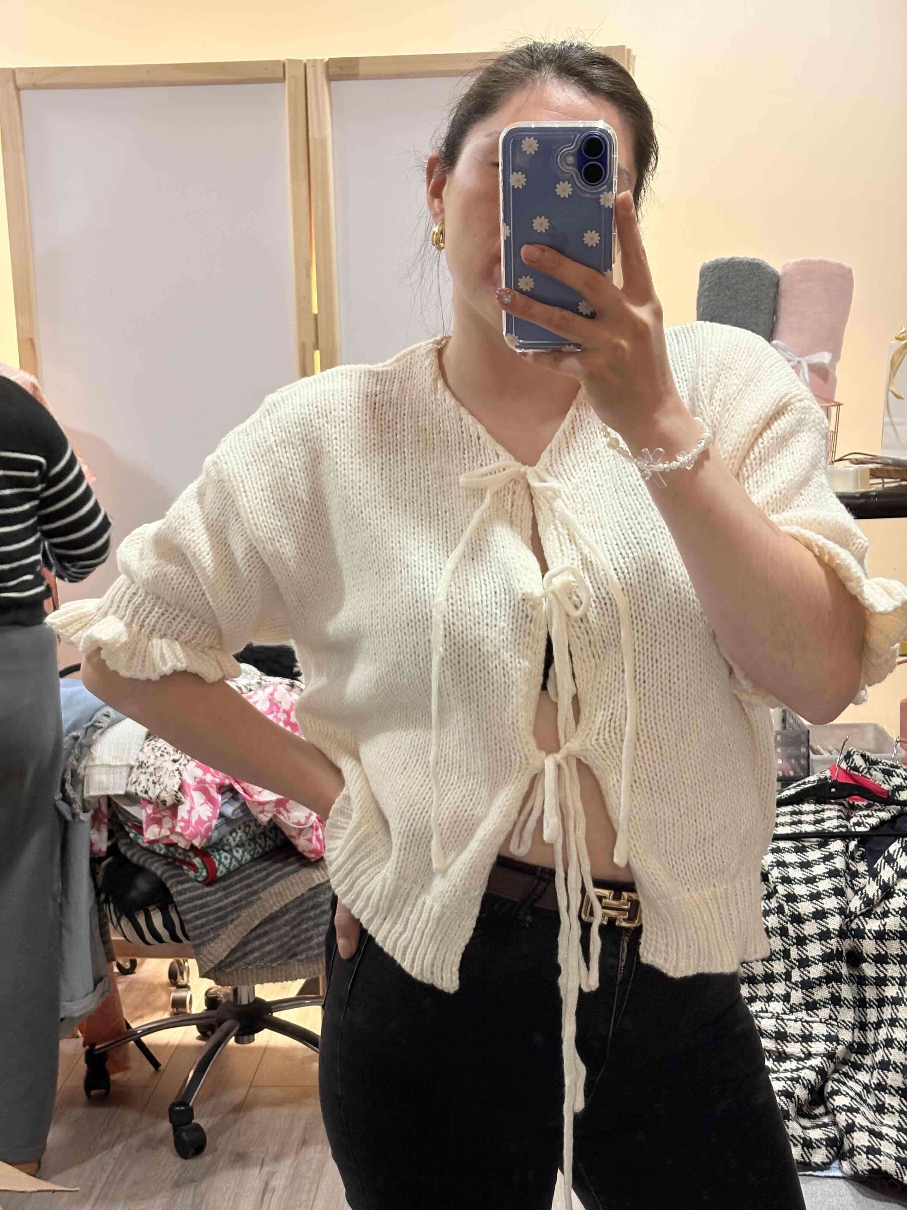 Cardigan de punto blanco con diseño ajustable al frente. En buen estado, perfecto para un look casual.
