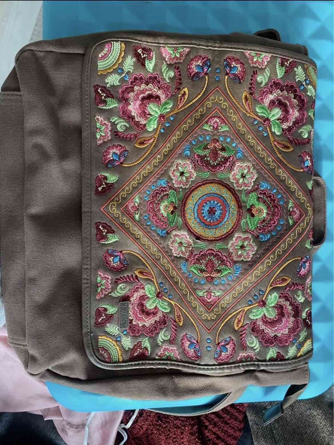 Bolso con diseño étnico colorido y detallado. En buen estado, perfecto para estilo casual o bohemio. Con pequeños detalles, conversable