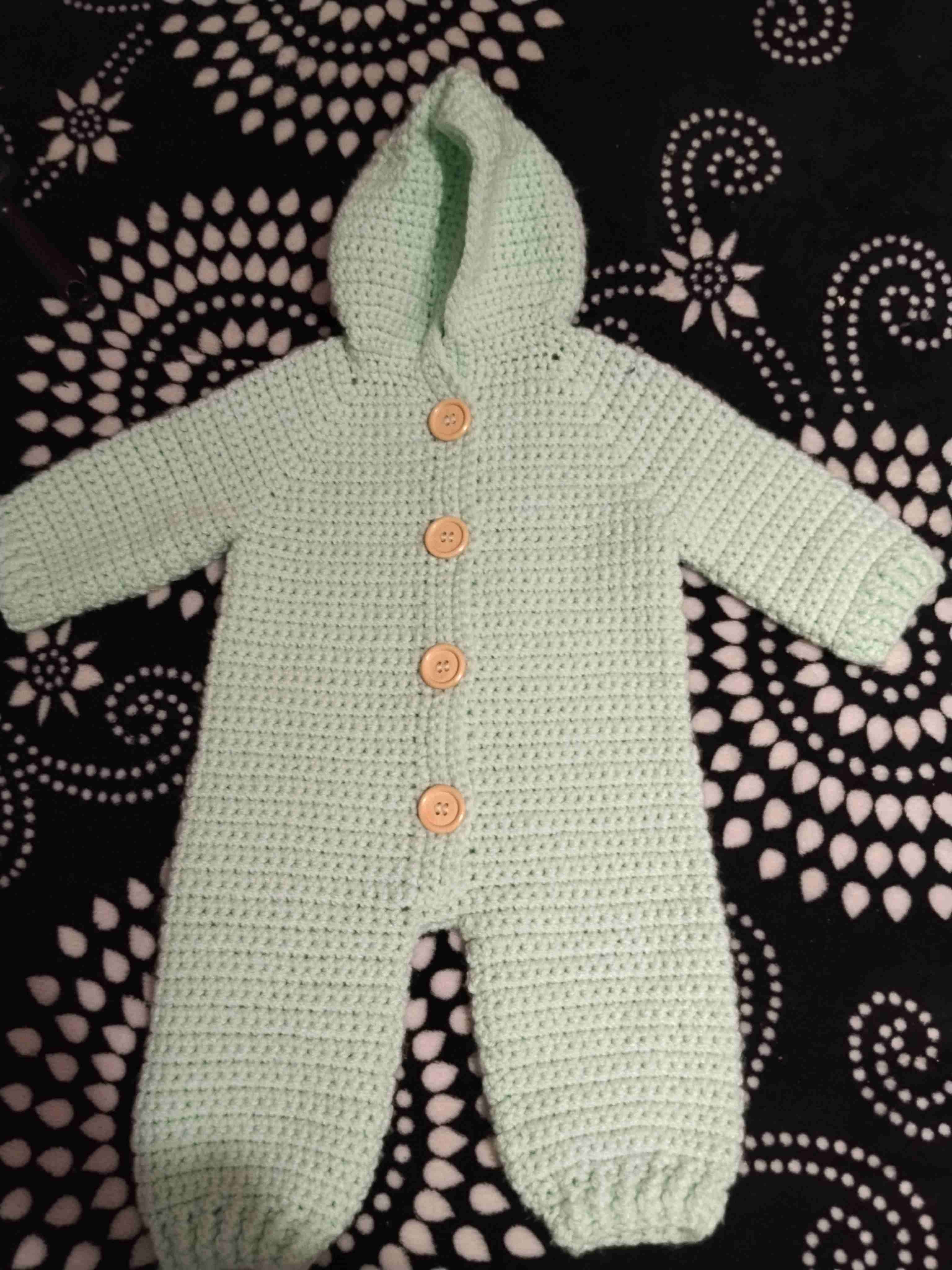 Enterito de lana verde claro con capucha, botones de madera. Perfecto para mantener abrigado a tu bebé. Buen estado.